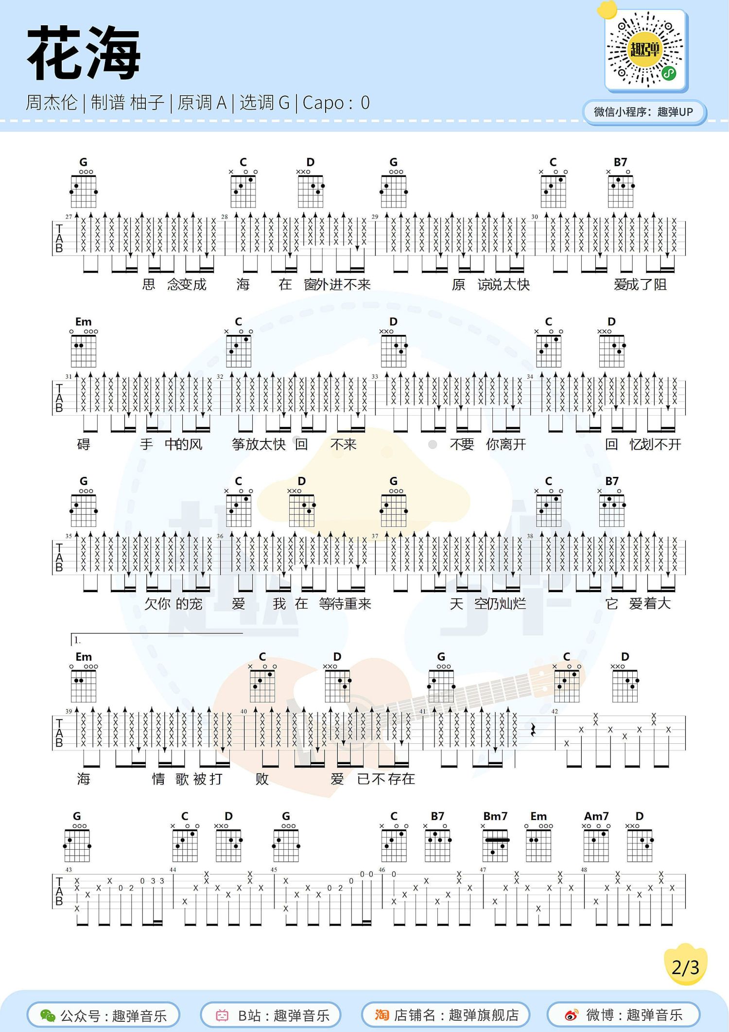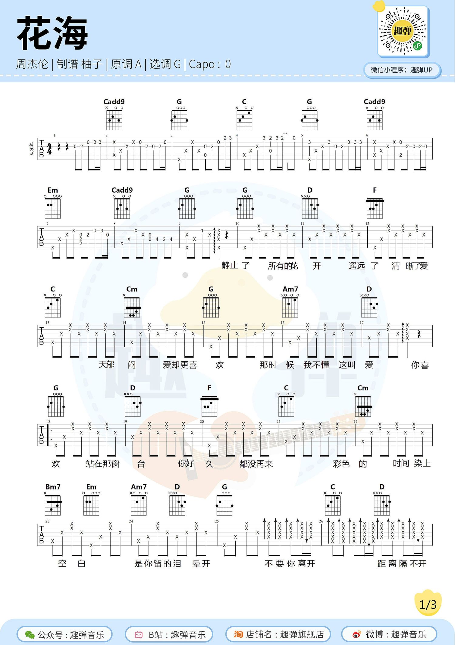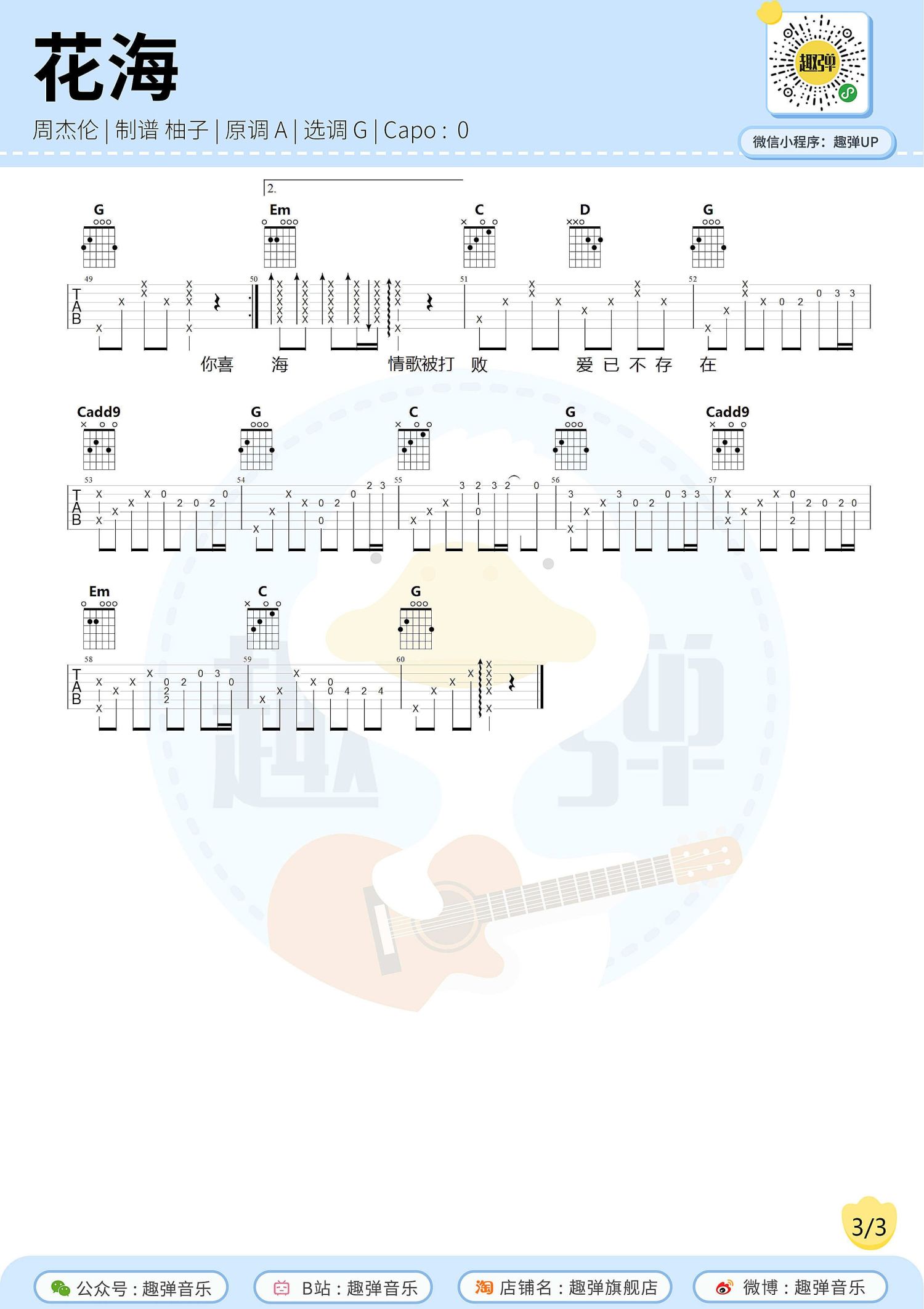 曲谱介绍: 周杰伦《花海》吉他谱_G调吉他弹唱谱