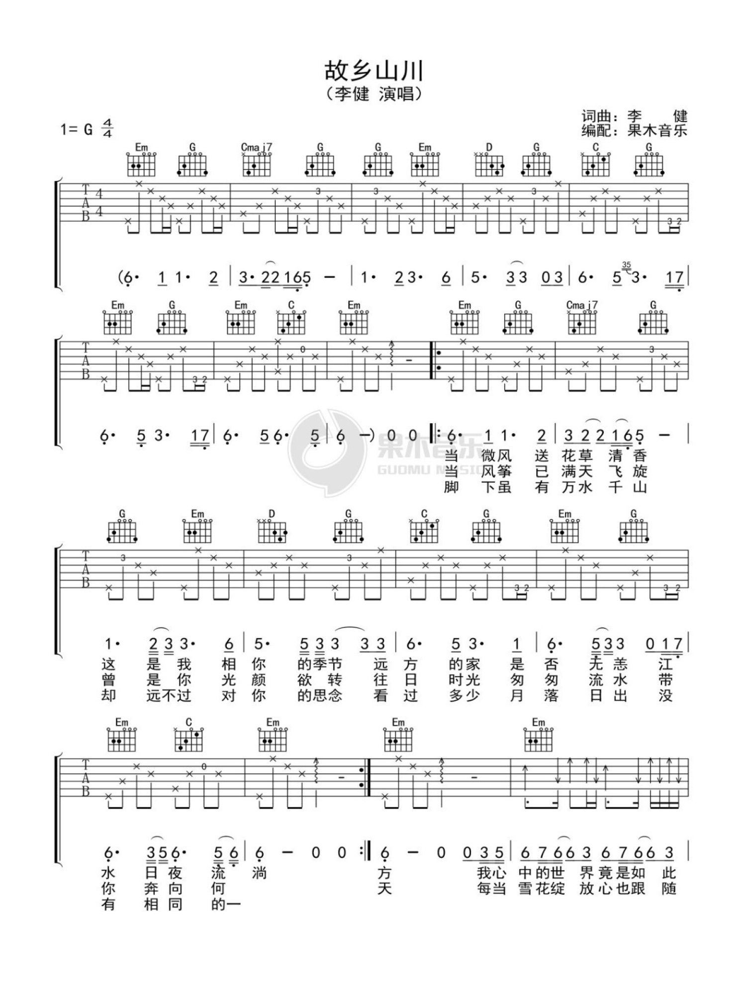 曲谱介绍: 李健《故乡山川》吉他谱_G调吉他弹唱谱
