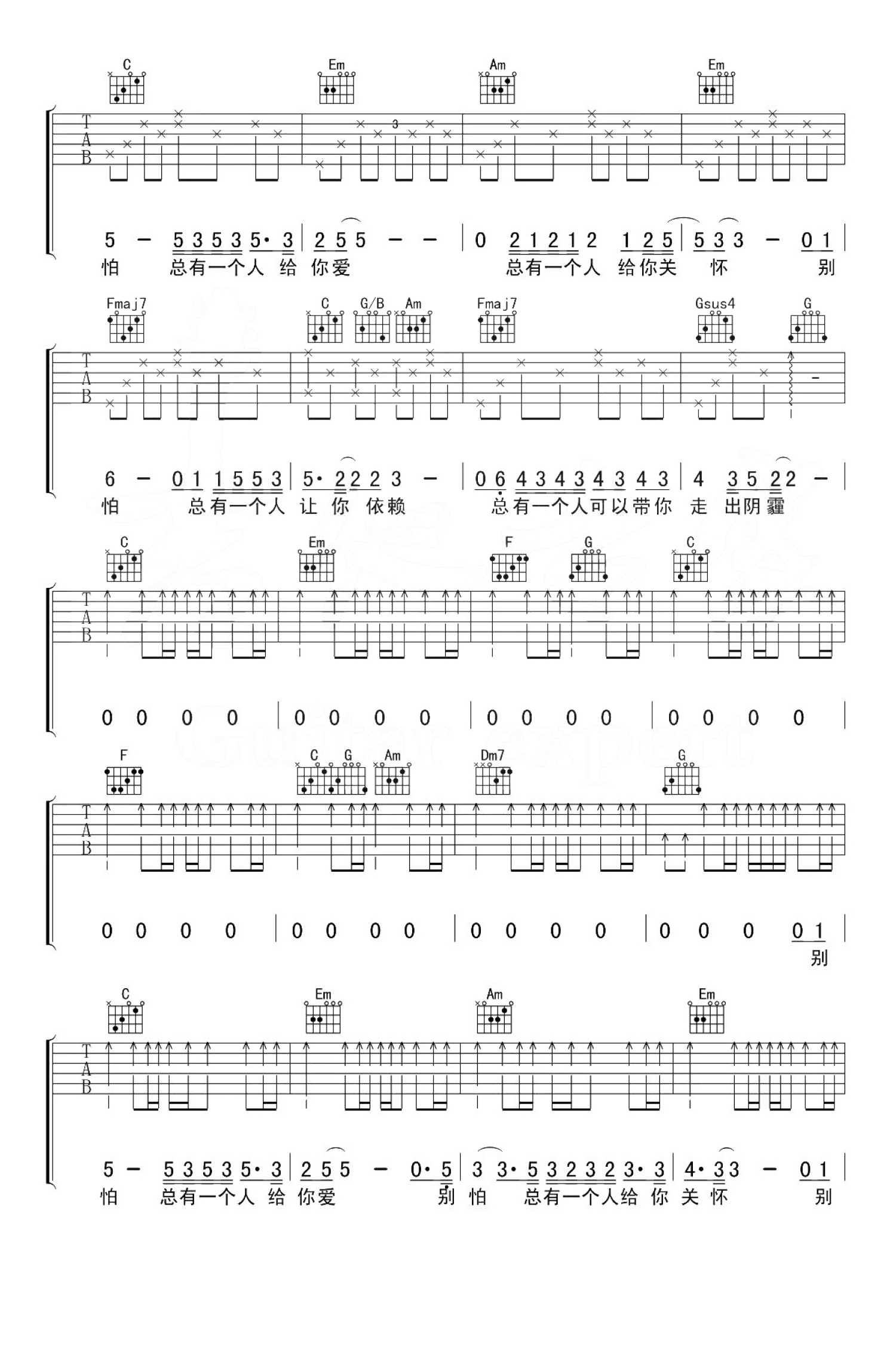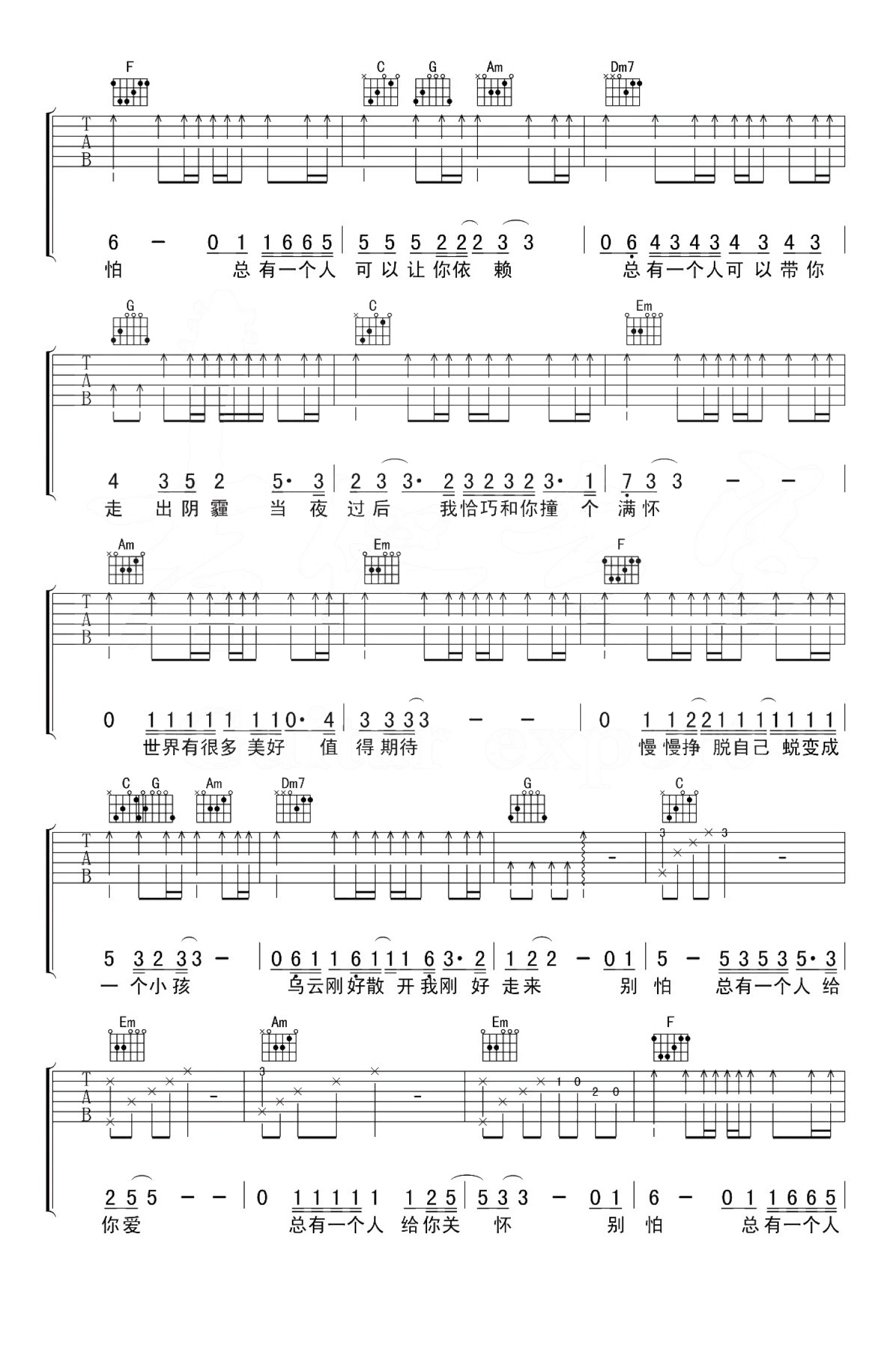 曲谱介绍: 一首非常温暖的情歌。别怕我在六线谱,原调降E,选用C调指法编配,变调夹夹第三品。这是隔壁老樊用音乐的形式向抑郁症群体的情感表达,真挚温暖的嗓音,直白的词汇,表达着对他们的关怀。用温暖感知世界,用歌声为他们拨开阴霾,希望听到这首歌的你们,都能感受到世间的温暖。总有一个人给你爱,总有一个人告诉你,别怕,我在。