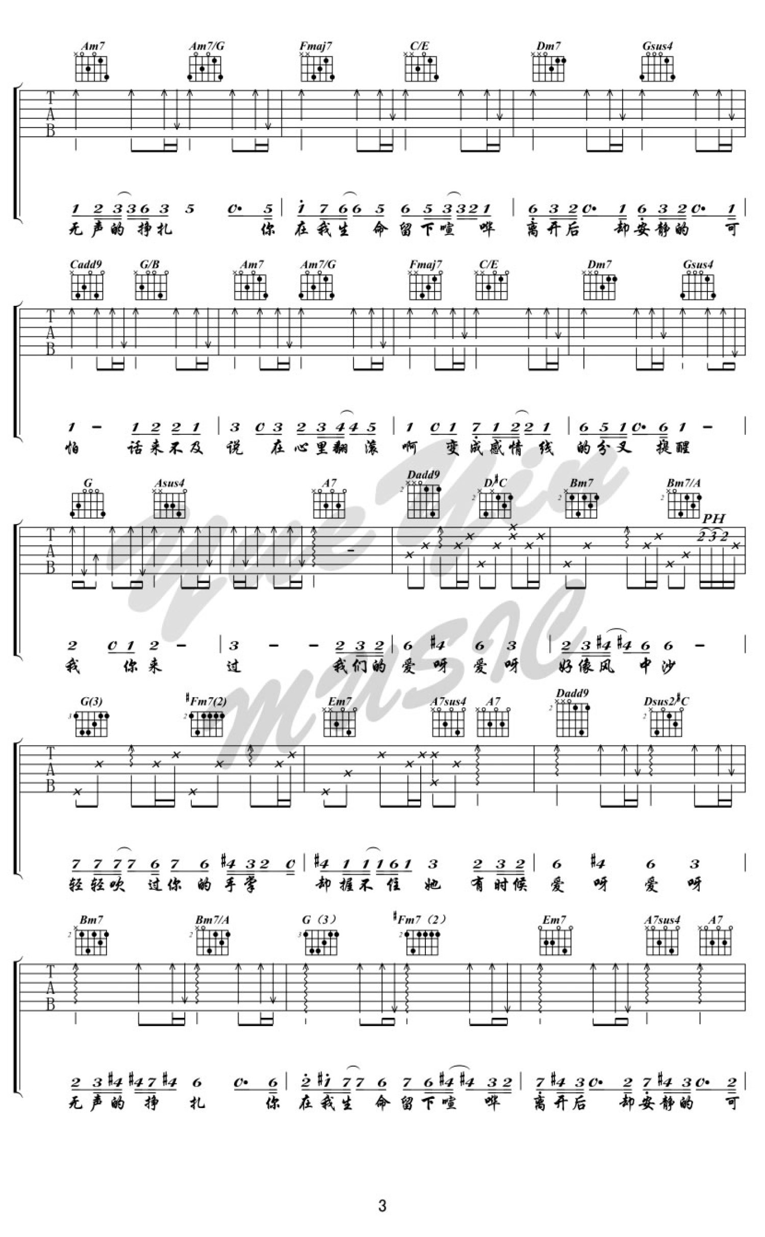 曲谱介绍: 金玟岐质感的声音,娓娓唱出爱情的忧伤与痛苦。岁月风平生命喧哗,爱恋中的此起彼伏直到最后无奈失去彼此。