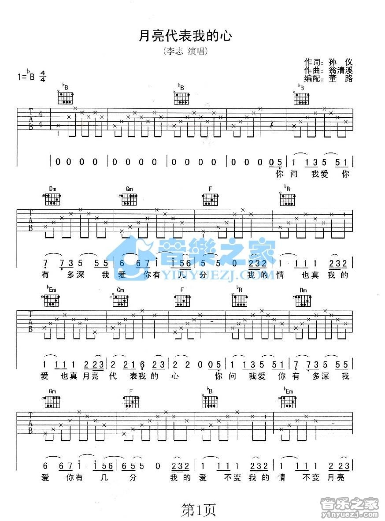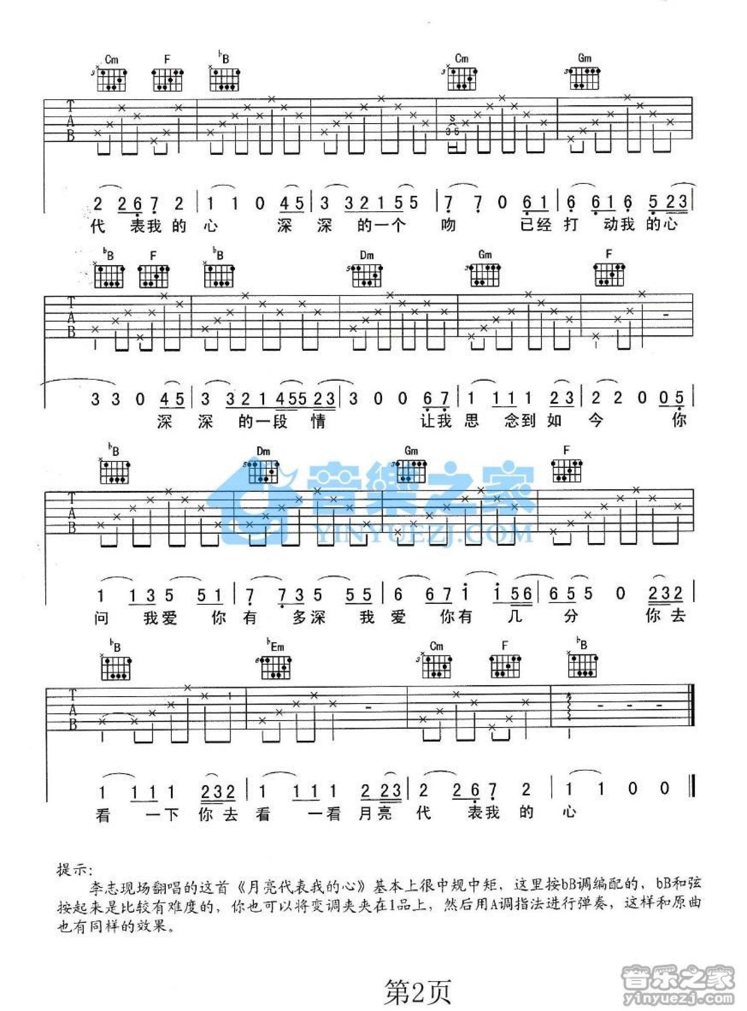 曲谱介绍: 李志《月亮代表我的心》吉他谱_B调吉他弹唱谱