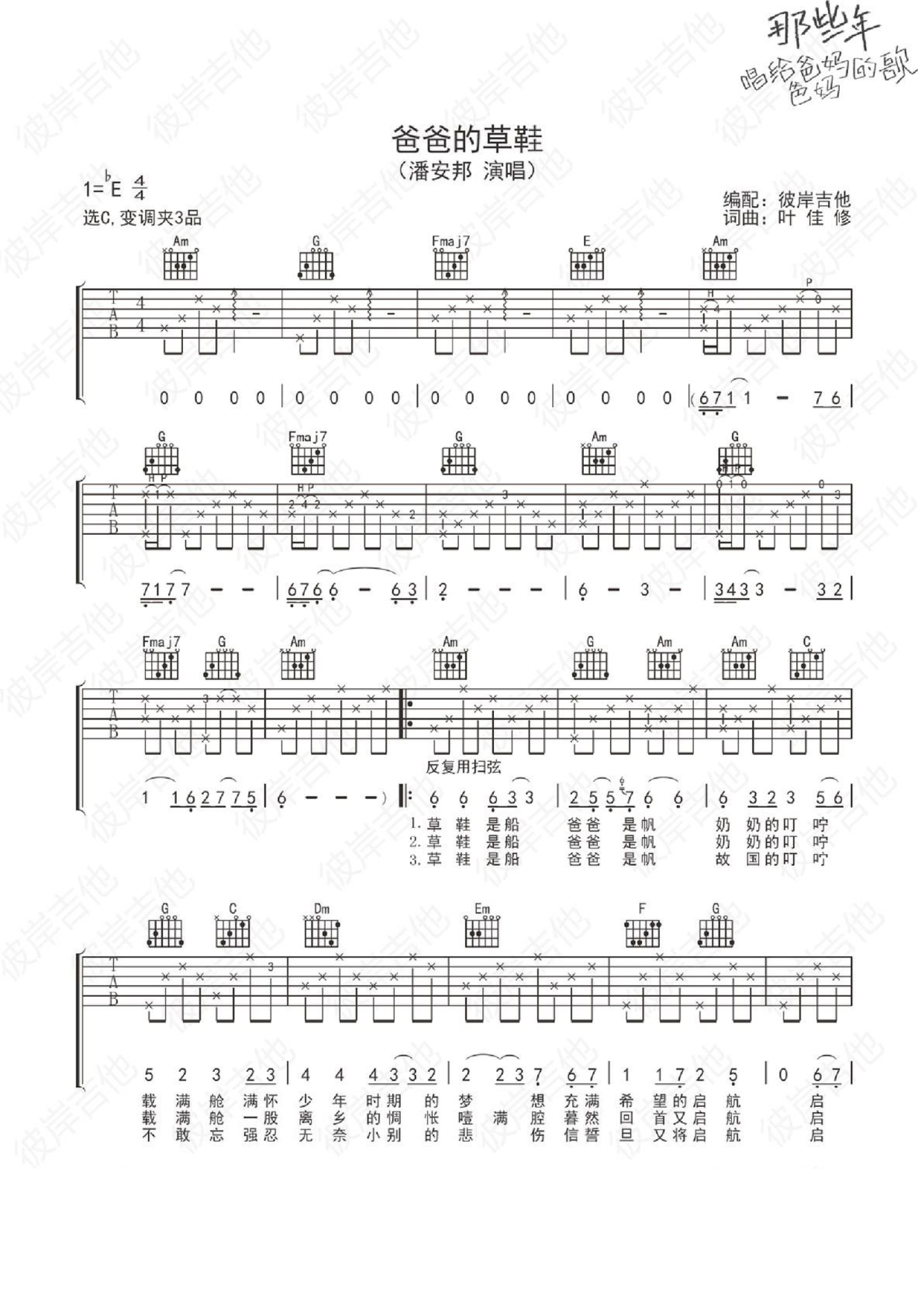 曲谱介绍: C调版《爸爸的草鞋》吉他弹唱六线谱
