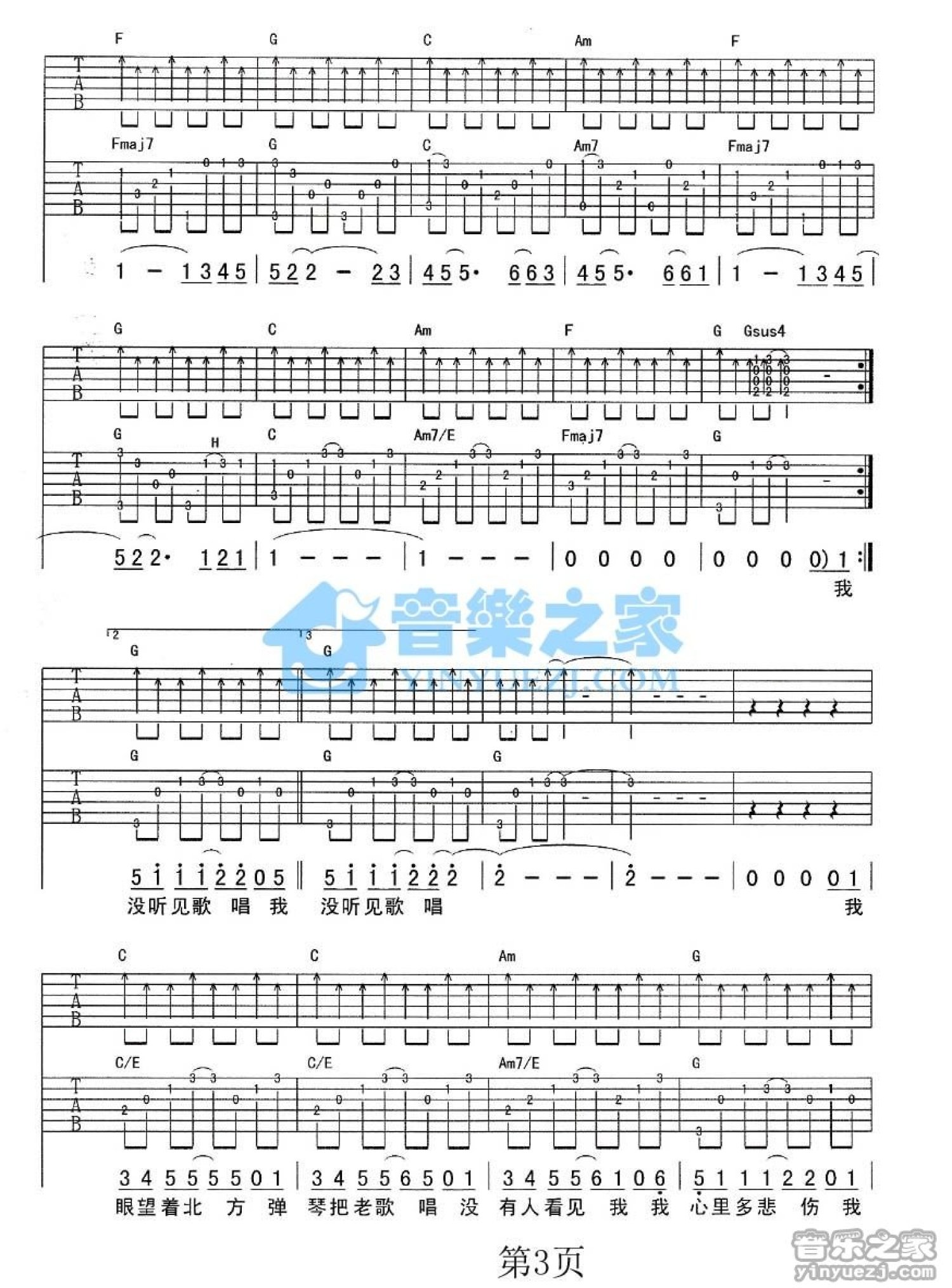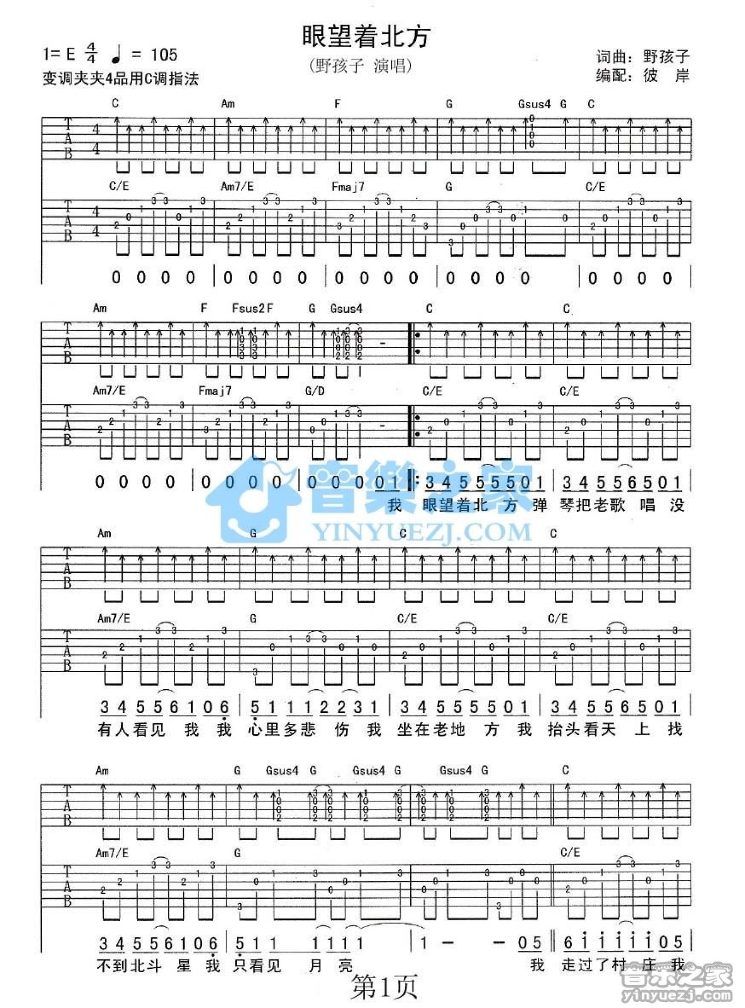 曲谱介绍: C调双吉他版张玮玮《眼望着北方》吉他弹唱六线谱
