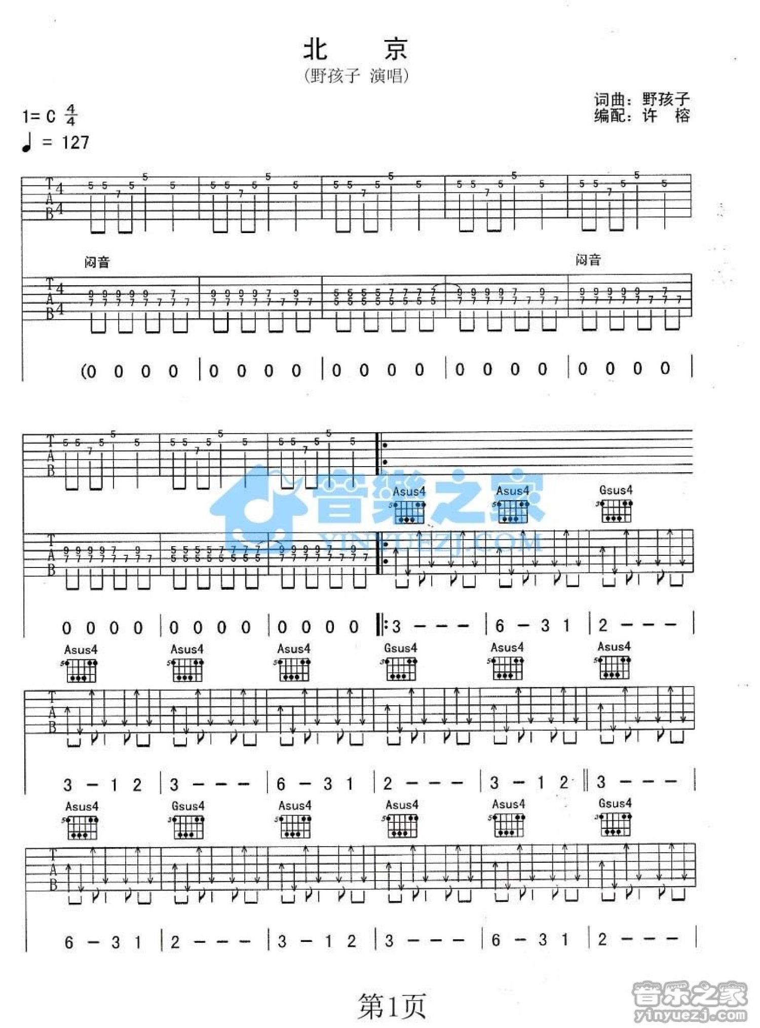 曲谱介绍: C调双吉他版野孩子《北京》吉他弹唱六线谱