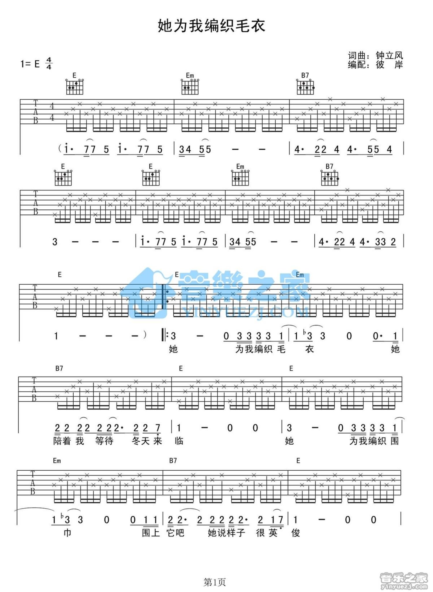 曲谱介绍: E调版钟立风《她为我编织毛衣》吉他弹唱六线谱