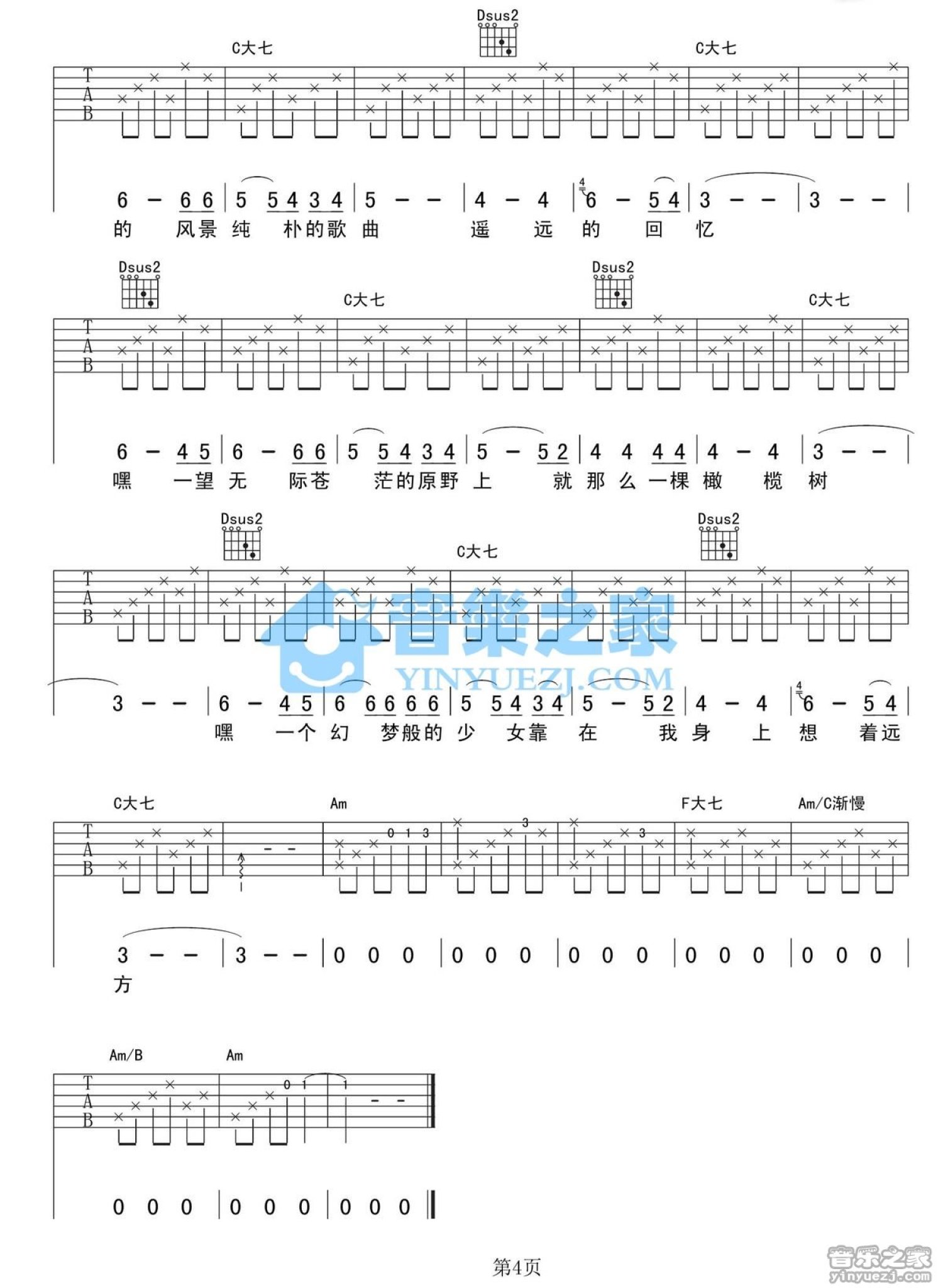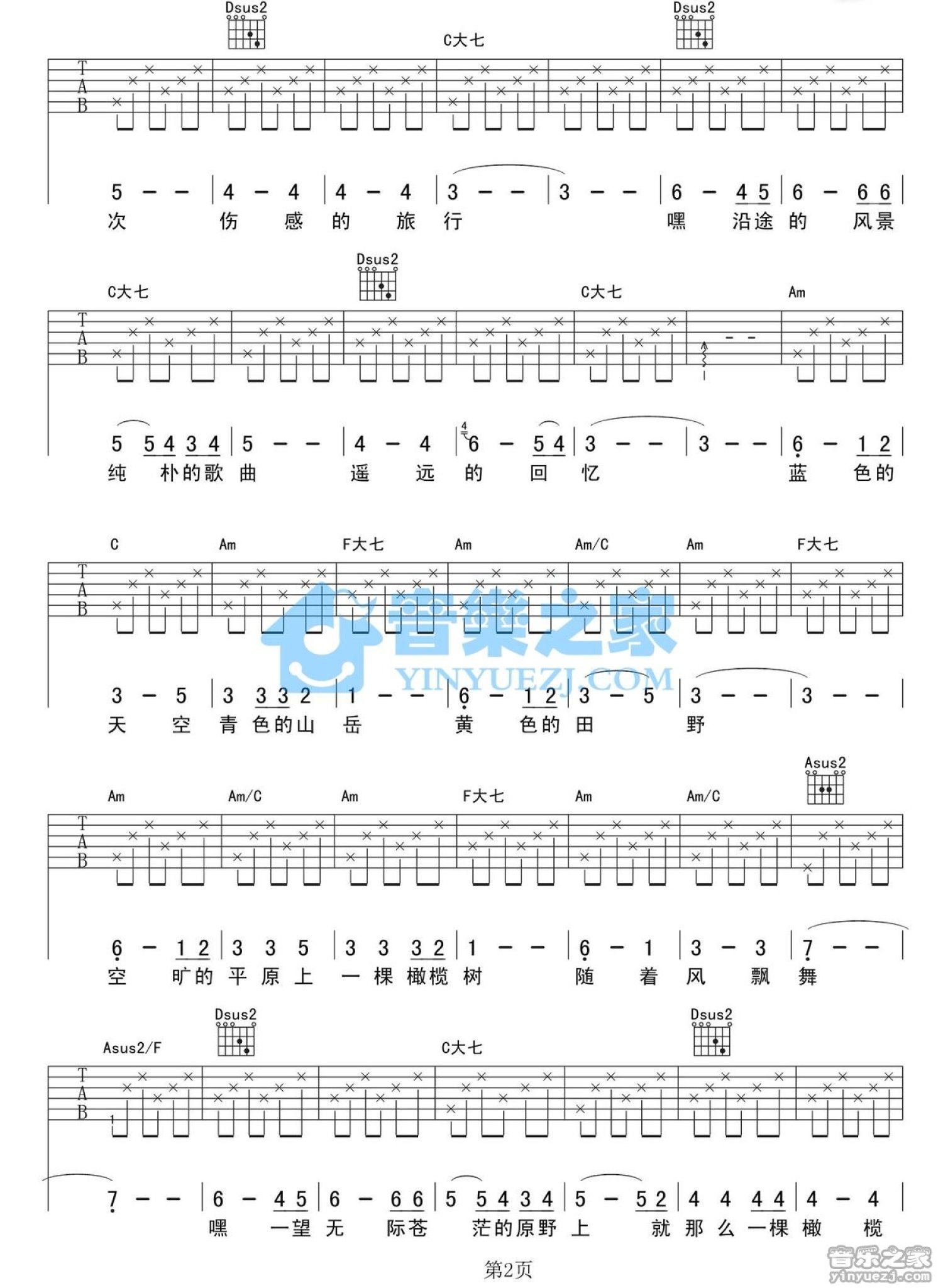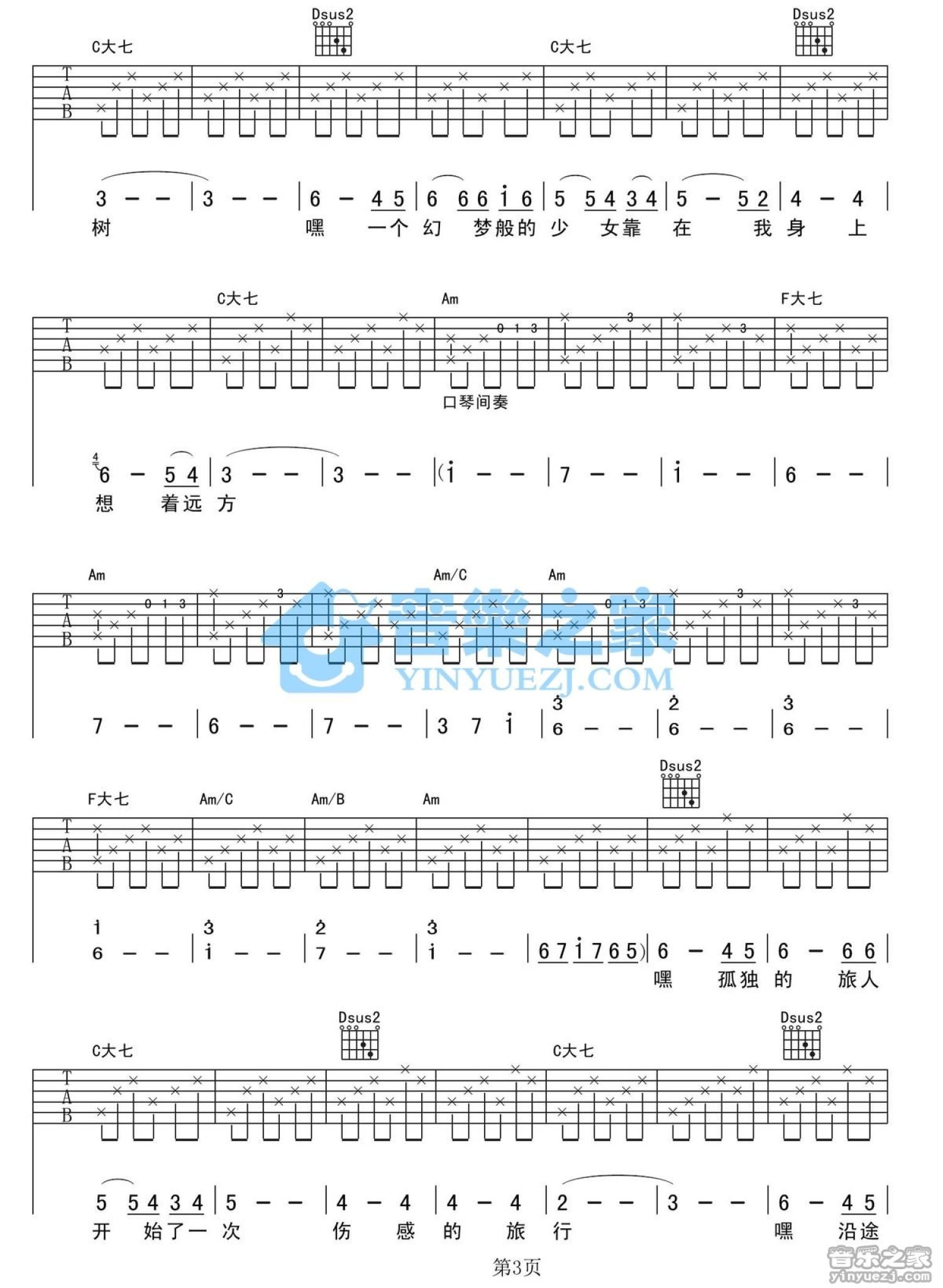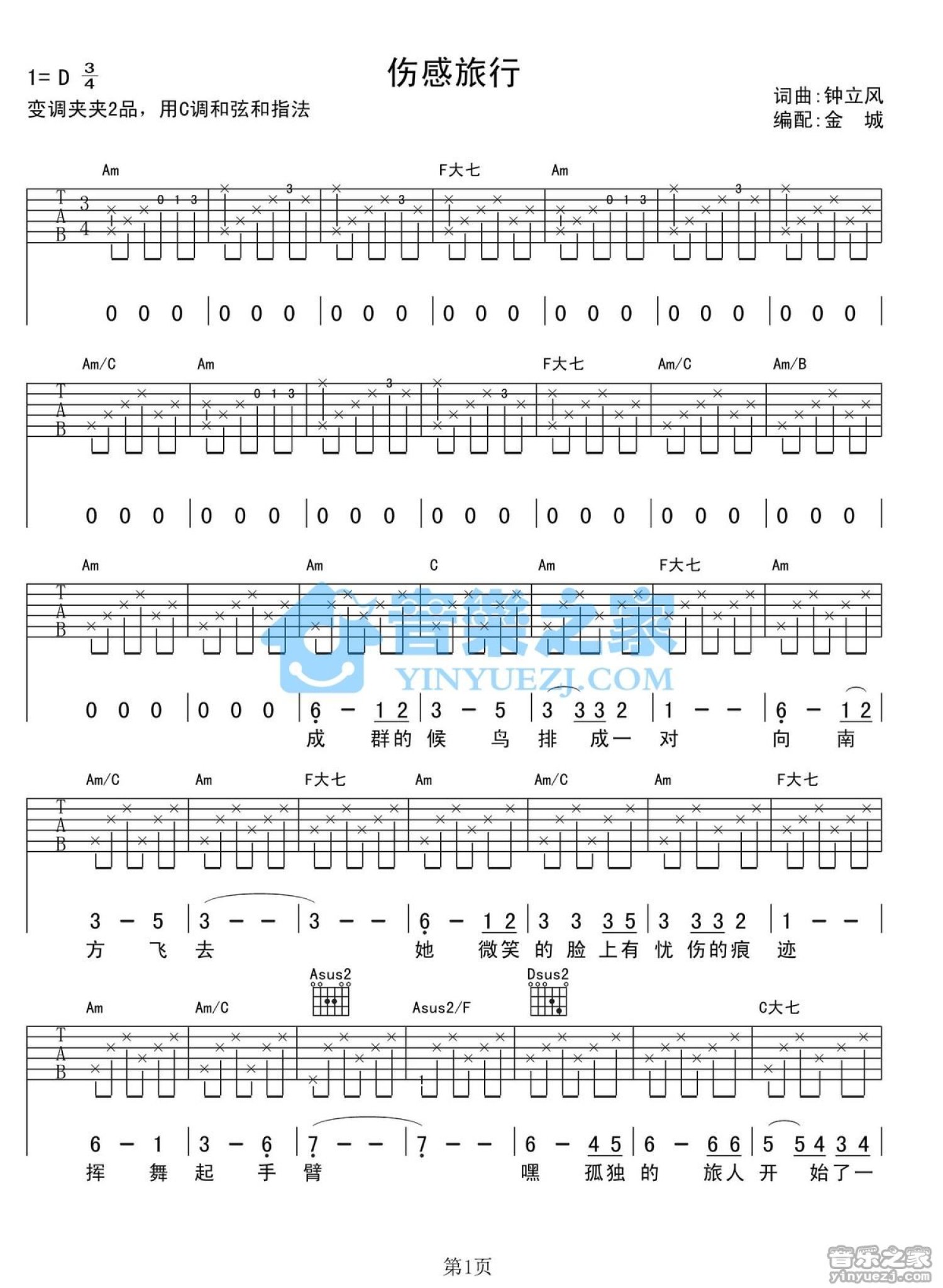 曲谱介绍: C调版钟立风《伤感旅行》吉他弹唱六线谱