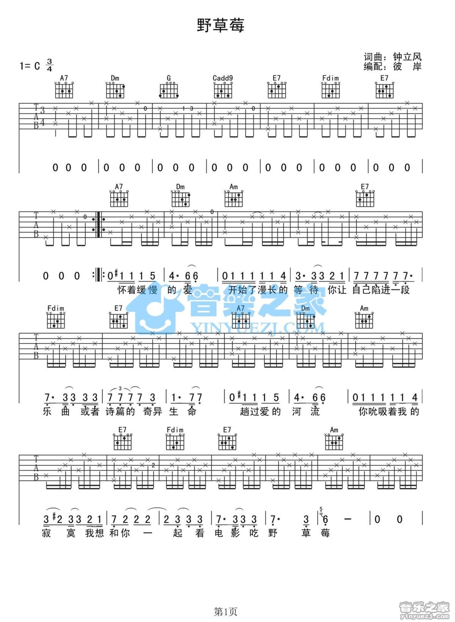 曲谱介绍: C调版 钟立风《野草莓》吉他弹唱六线谱