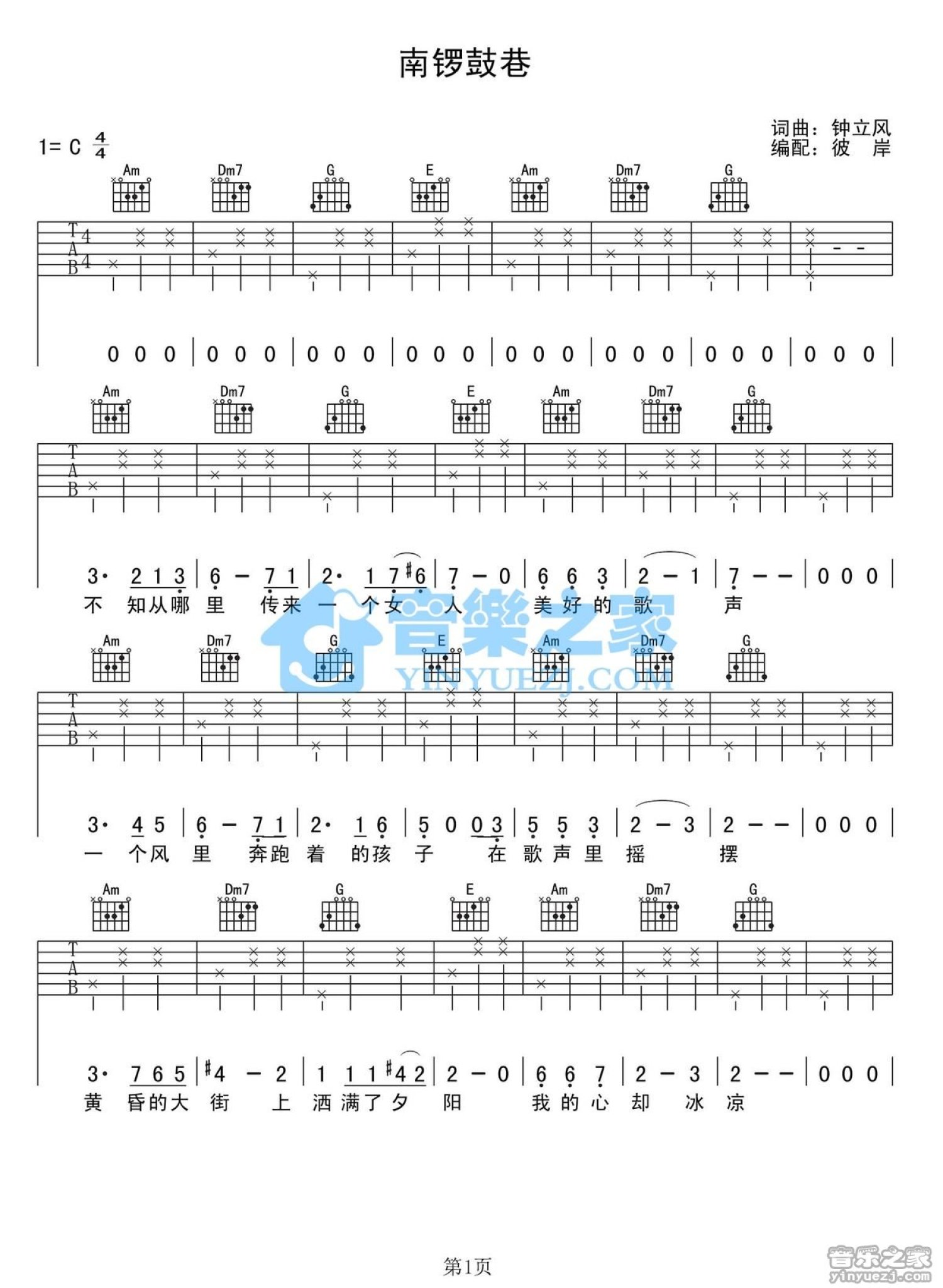 曲谱介绍: C调版钟立风《I南锣鼓巷》吉他弹唱六线谱