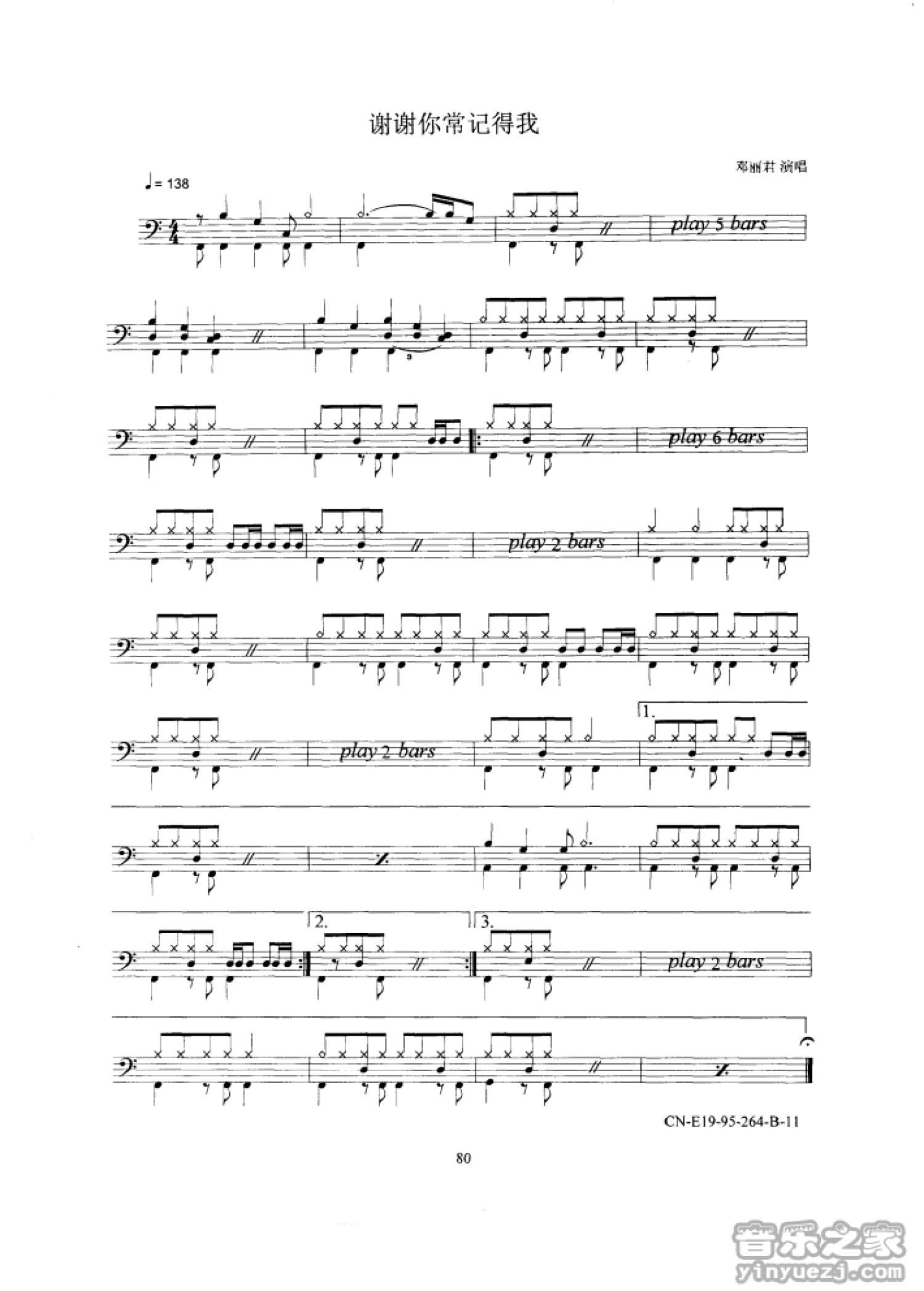 曲谱介绍: 邓丽君《谢谢你常记得我》架子鼓谱