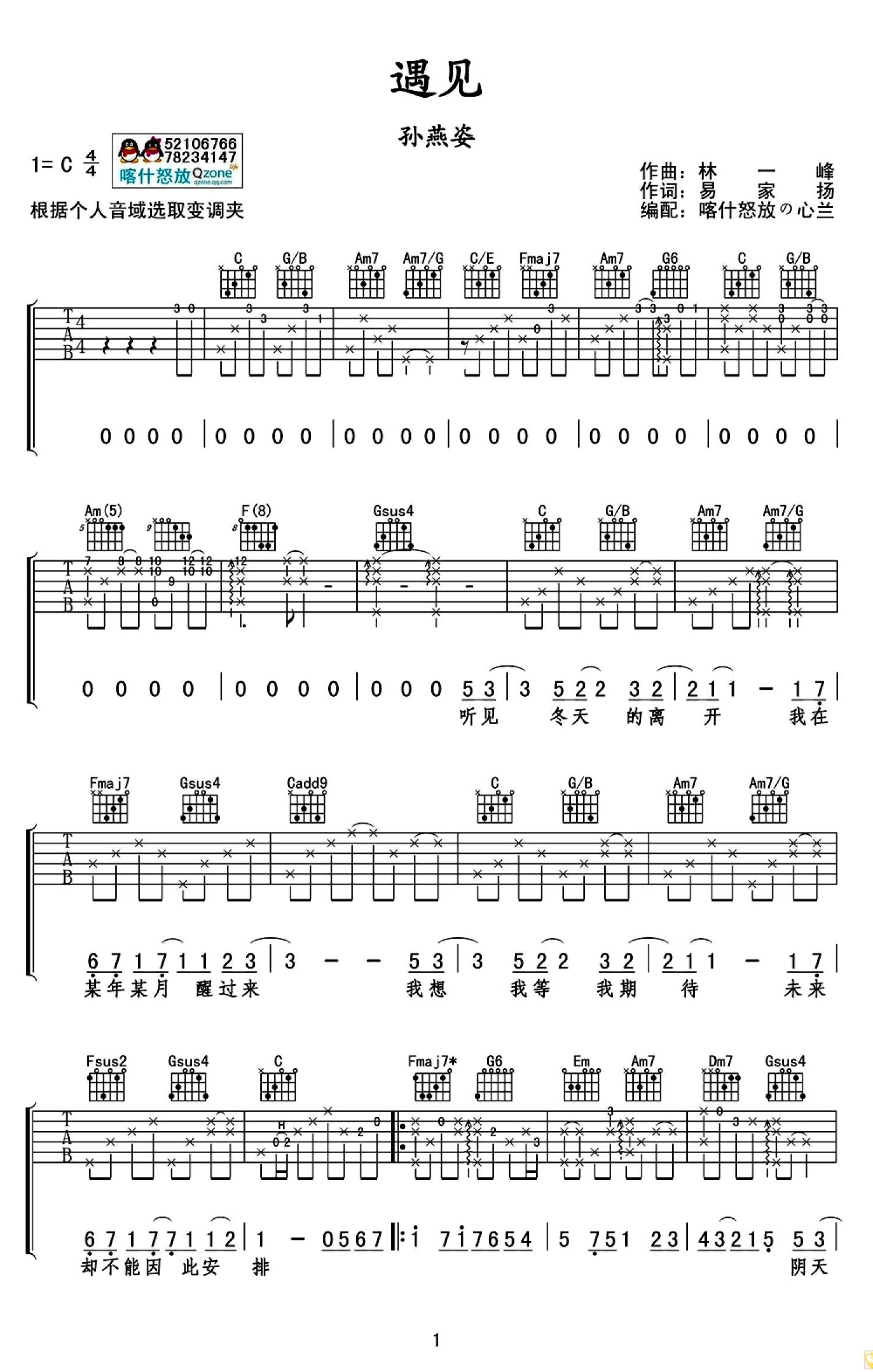 遇见吉他谱 - C调吉他弹唱谱