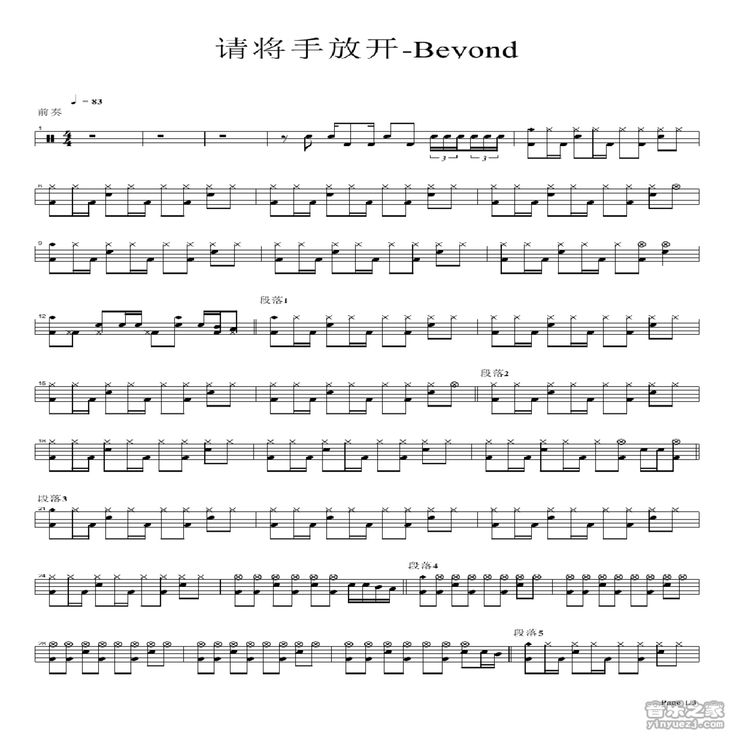 请将手放开鼓谱 - beyond - 架子鼓谱