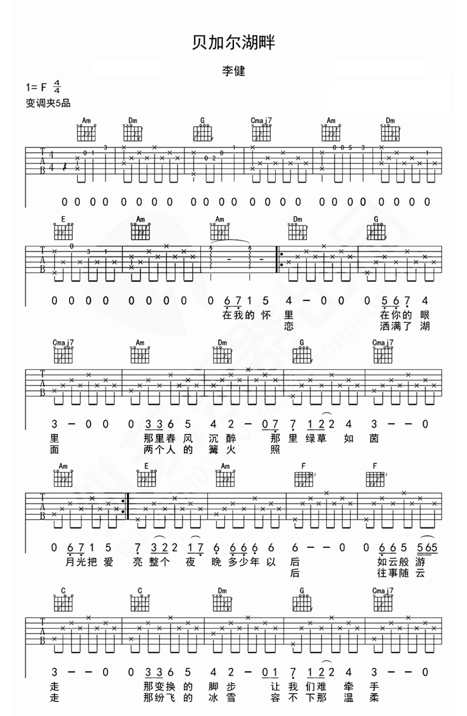 曲谱介绍: 原调F,变调夹夹五品,李健的经典吉他弹唱歌曲,前奏一起就让人印象深刻的唯美之歌,是对年轻的追忆,唱出了我们都回不去的青春。个人很喜欢《贝加尔湖畔》这首歌,李健的原唱和李维周深的合唱都喜欢。李健的版本淡淡的却更有深度,唱出了一种相濡以沫的隐忍;而李维周深的激情版唱出了一种相忘于江湖后重逢的感伤,周深的高音可谓疯狂交媾的高潮,让人落泪,但高潮之后是虚无。这两个版本告诉我们一个道理,就是:相濡相忘都疼痛!
