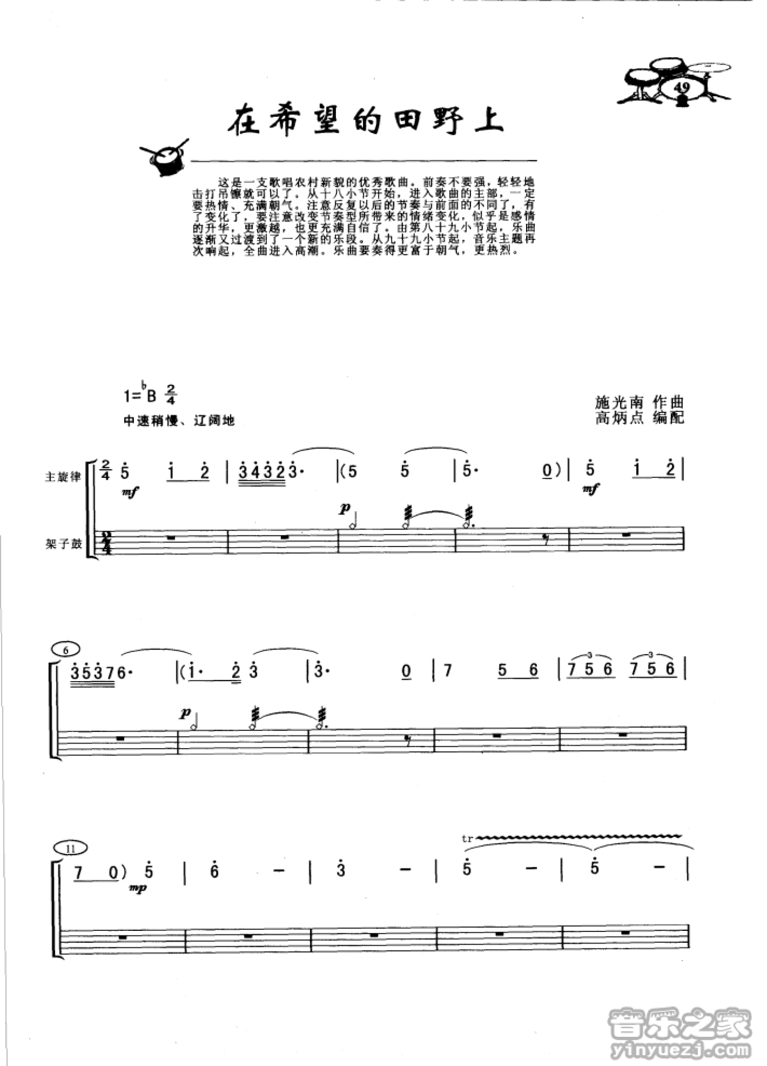 曲谱介绍: 《在希望的田野上》架子鼓谱