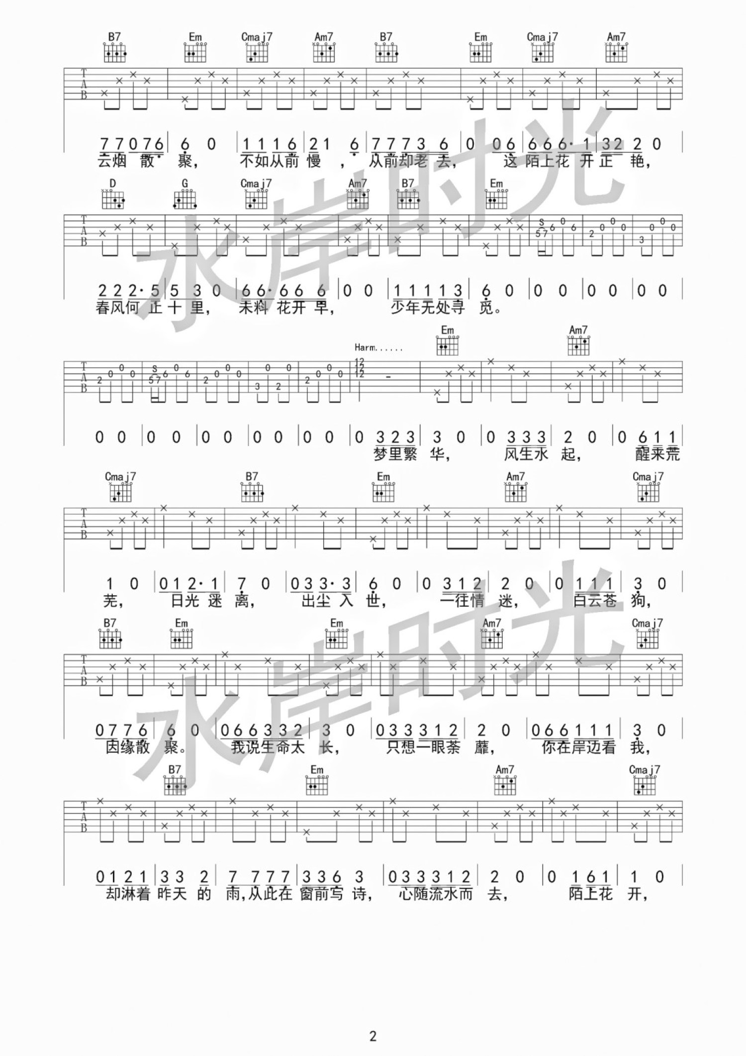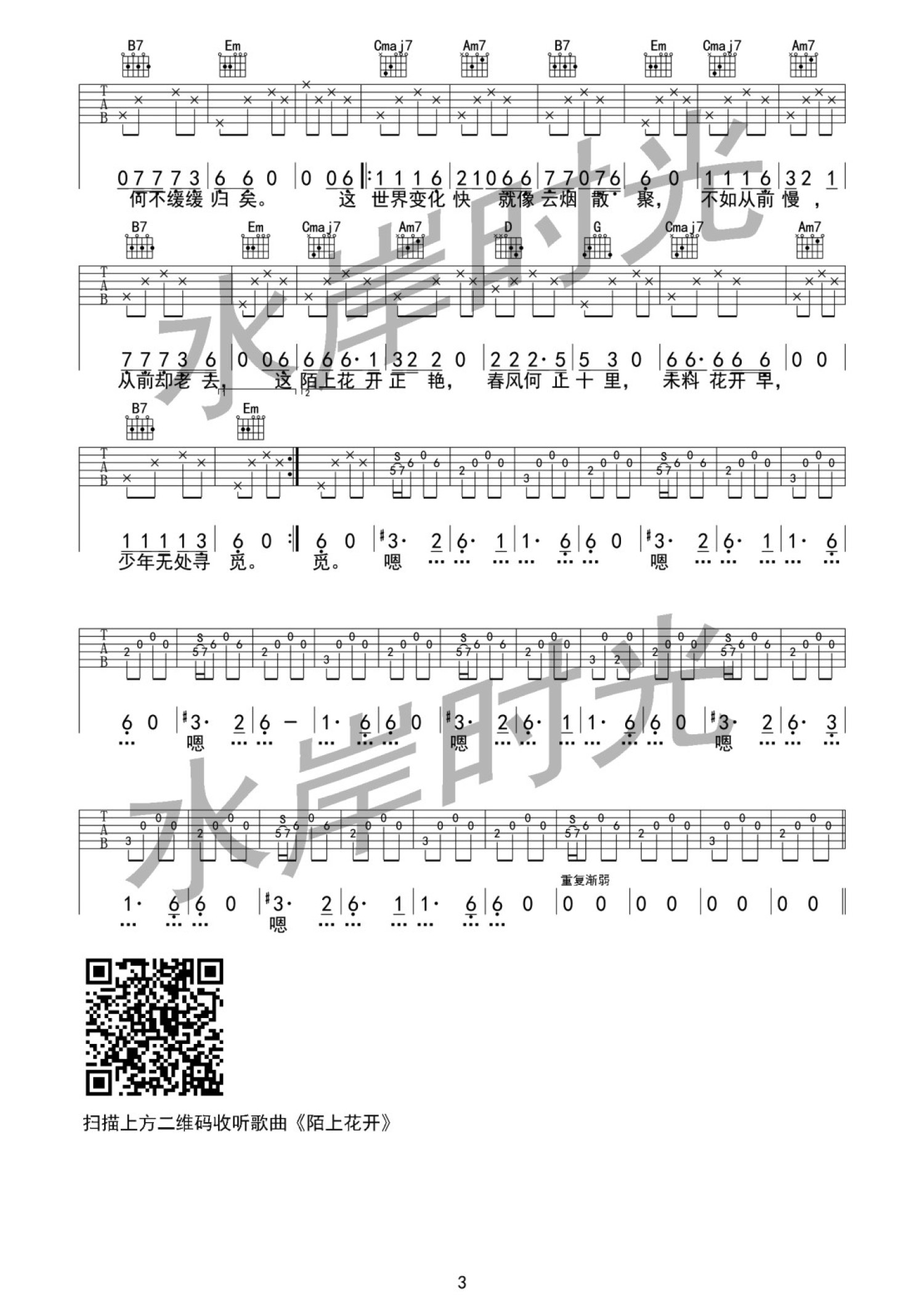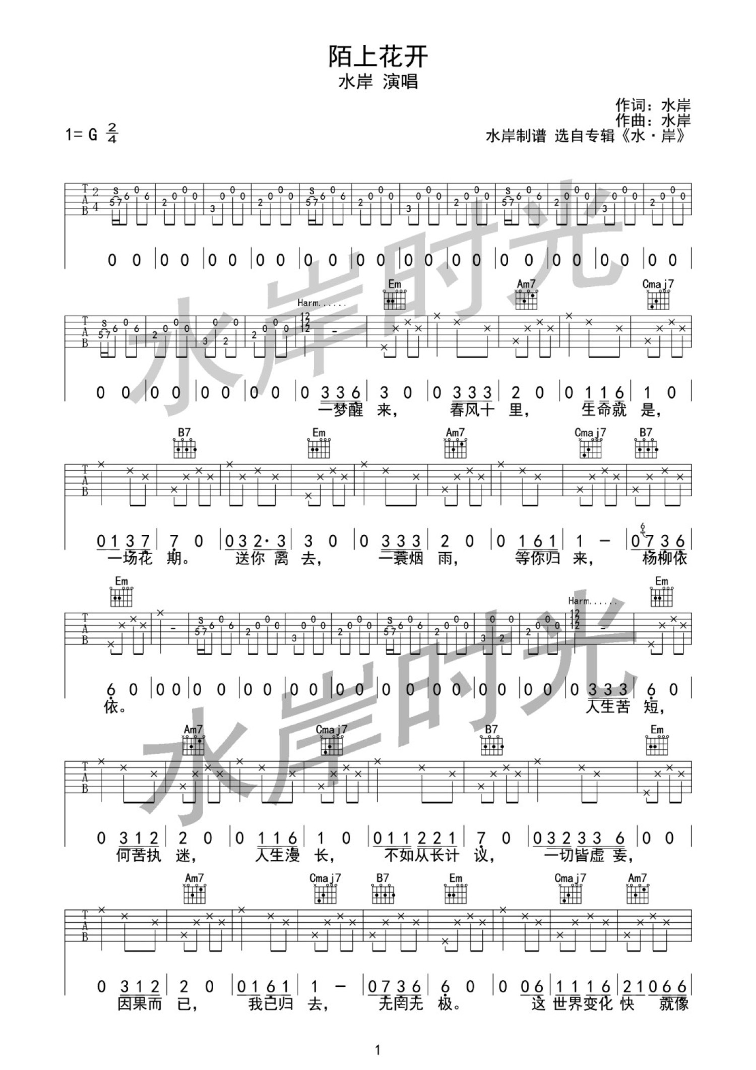 曲谱介绍: G调版水岸《陌上花开》吉他弹唱六线谱