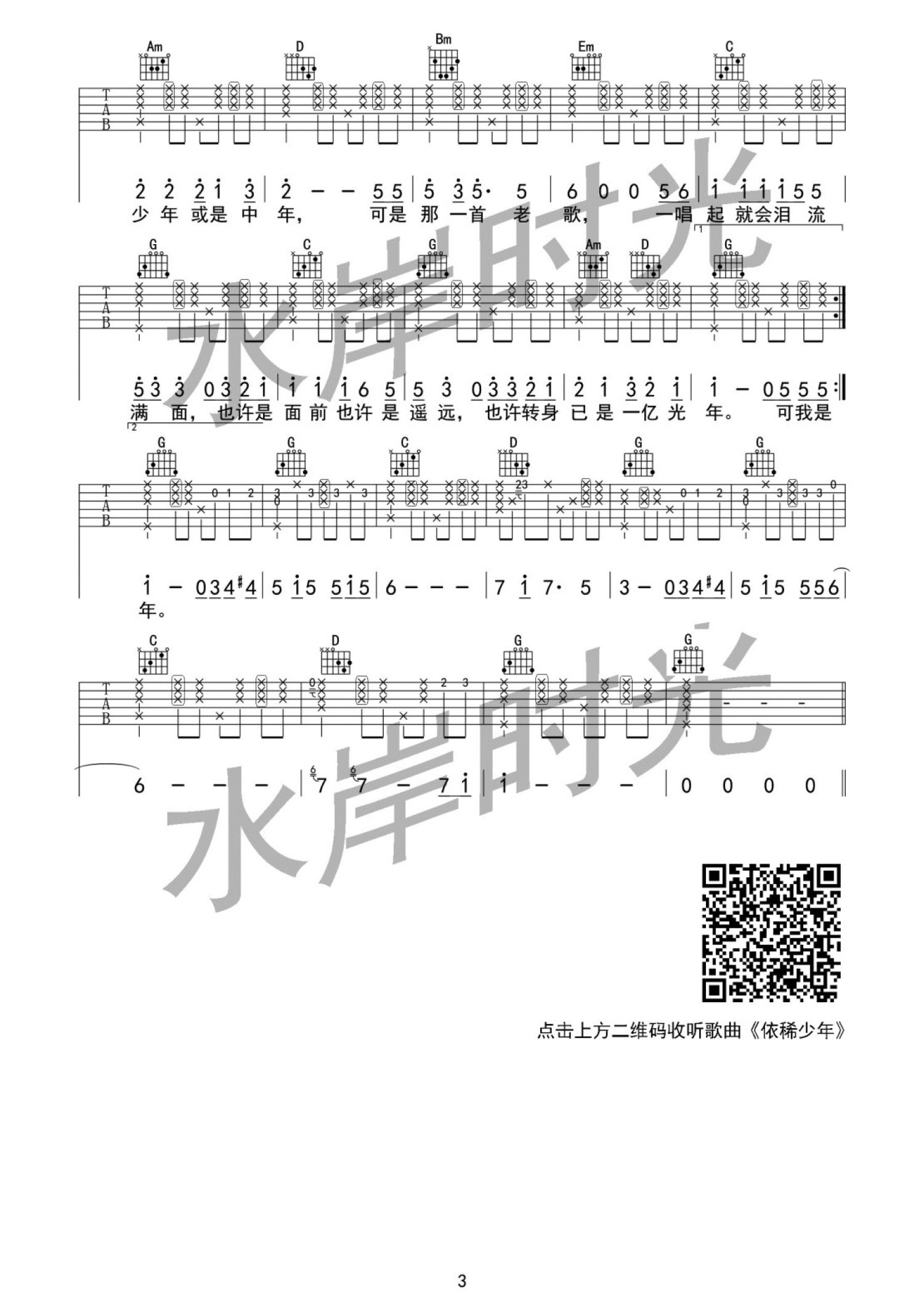 曲谱介绍: A调简单版《依稀少年》吉他弹唱六线谱