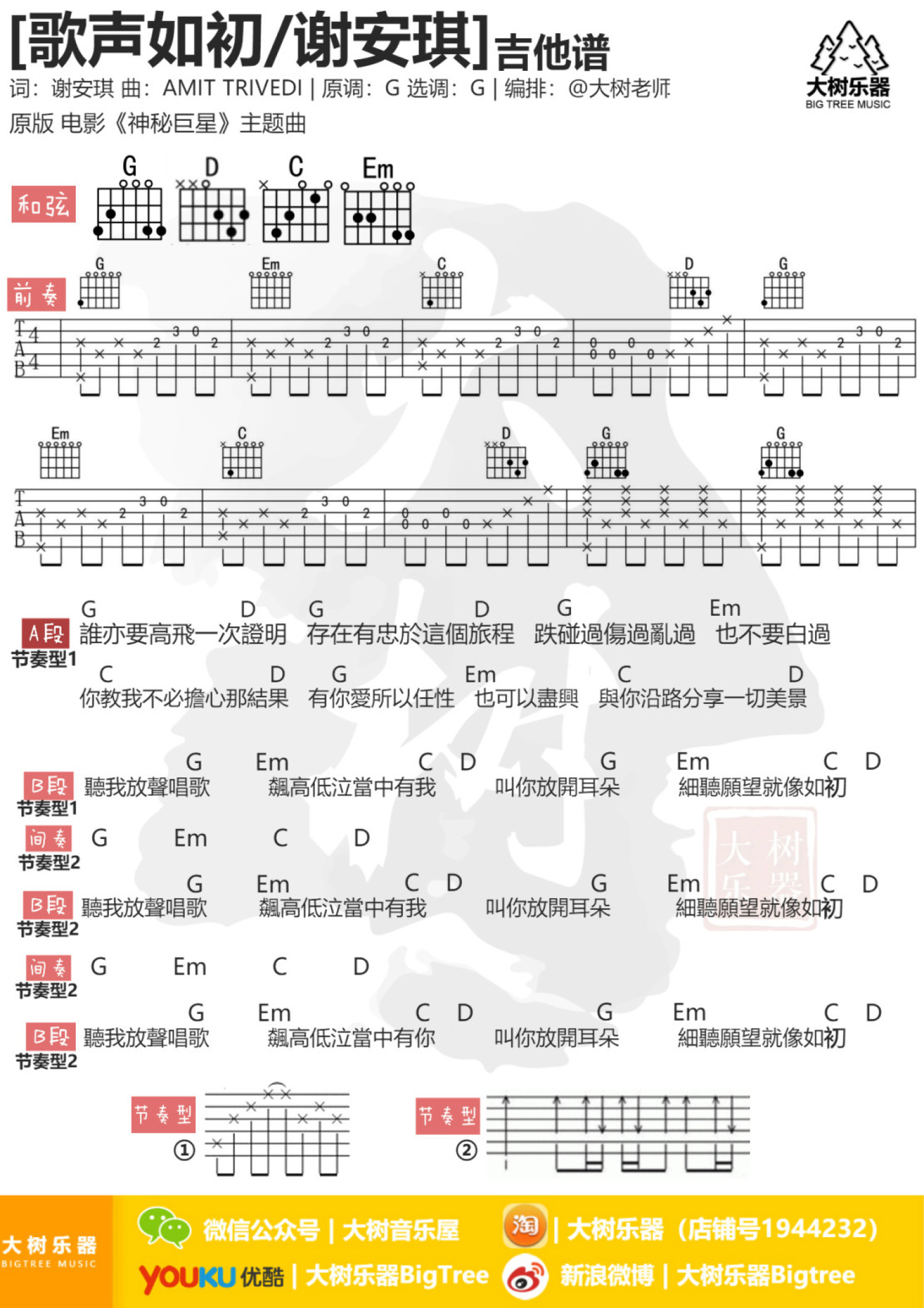 吉他弹唱G调来源:大树乐器263 浏览2021-03-26 20:54发布图谱共1页