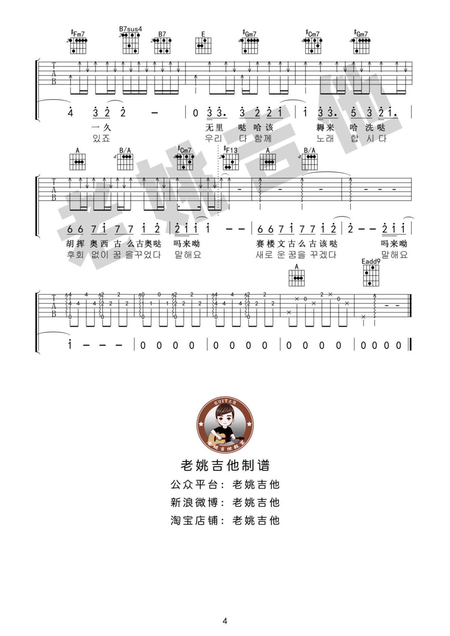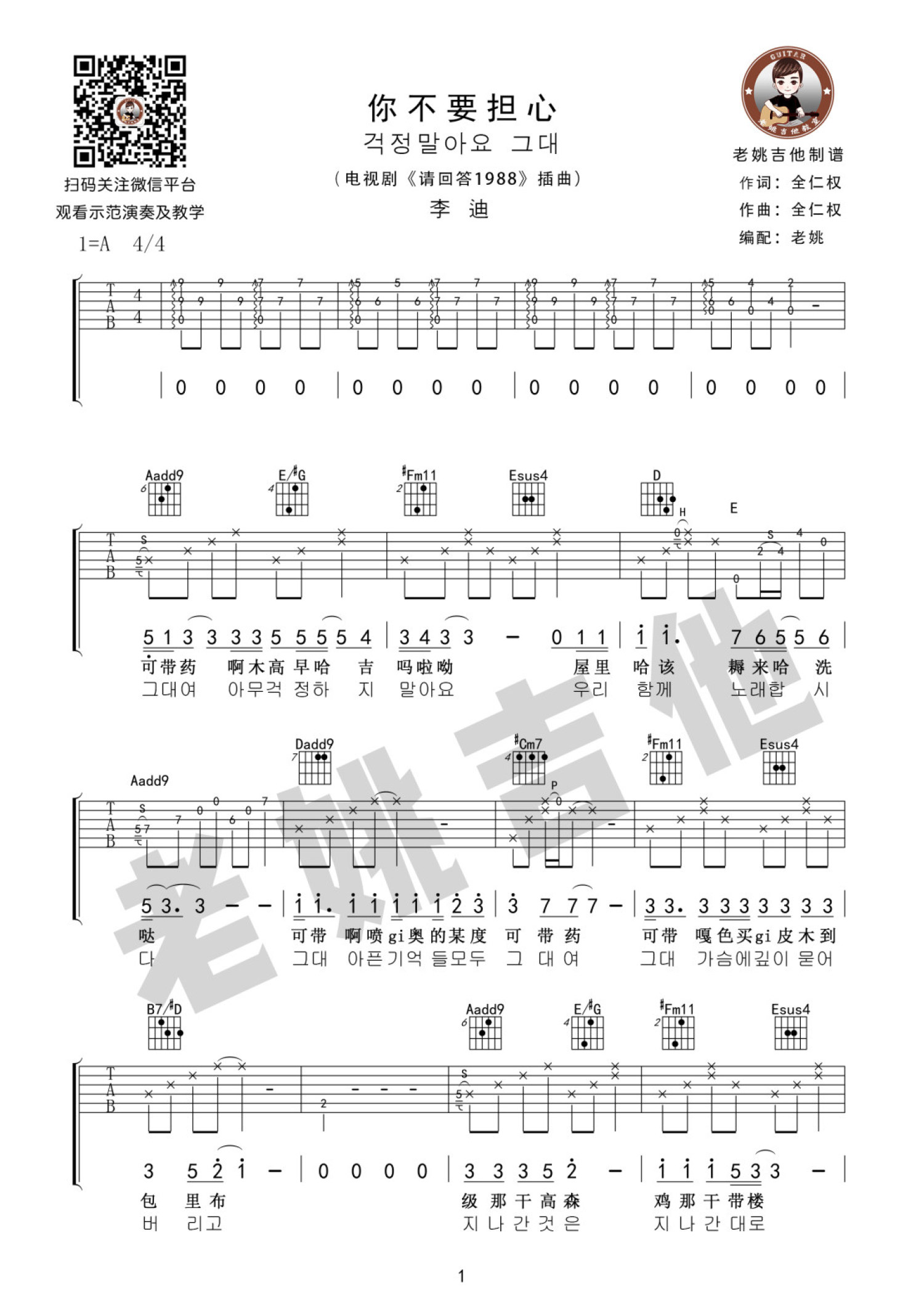 曲谱介绍: 老姚A调版《你不要担心了》吉他弹唱六线谱