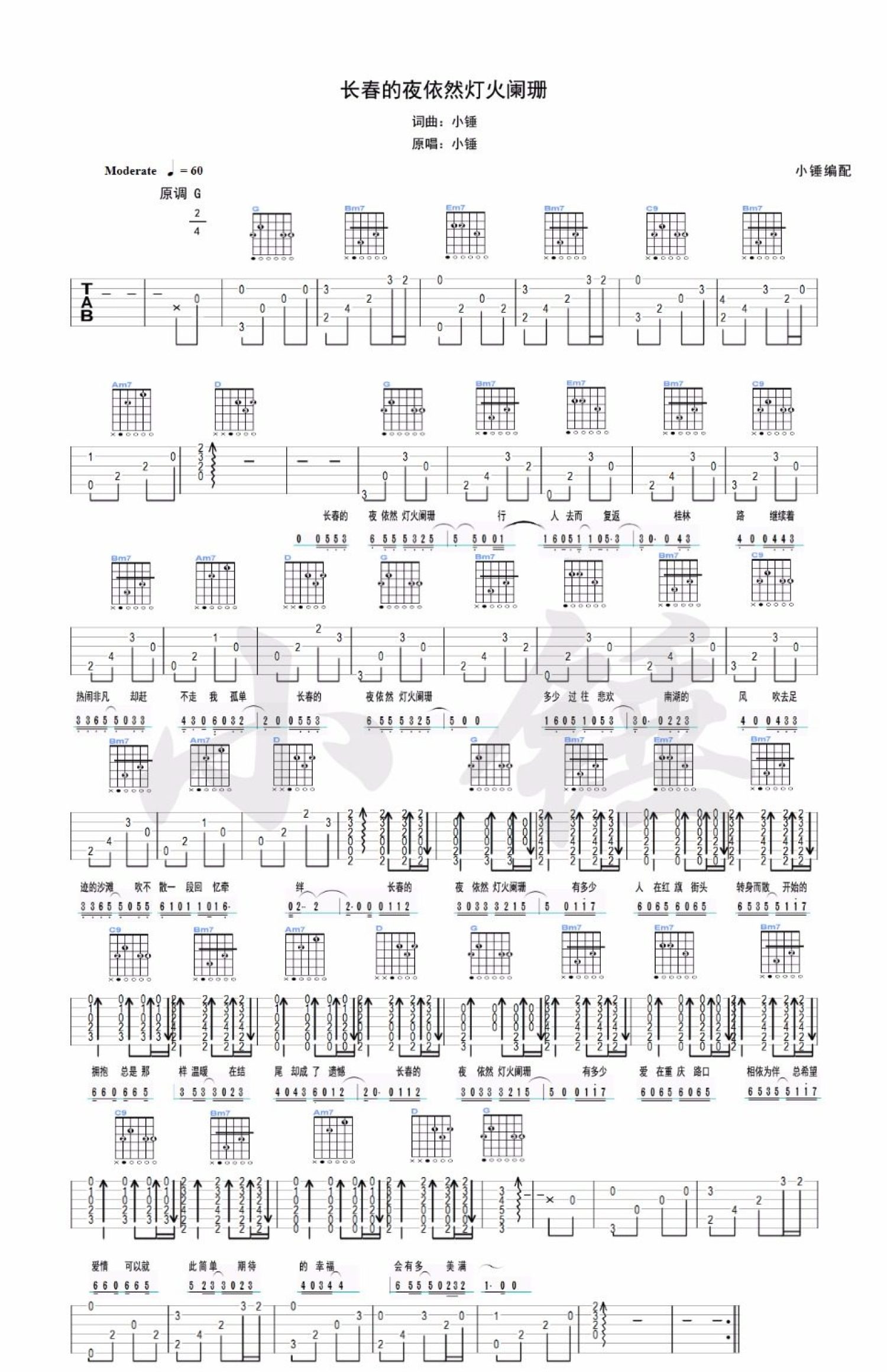 曲谱介绍: G调版《长春的夜依然灯火阑珊》吉他弹唱六线谱