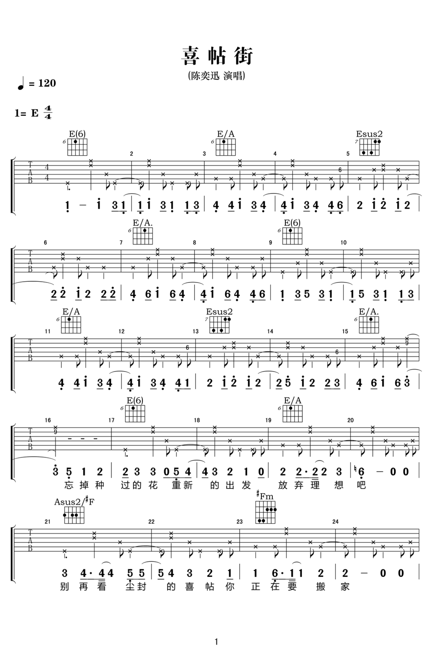 喜帖街吉他谱 - 陈奕迅/谢安琪 - E调吉他弹唱谱