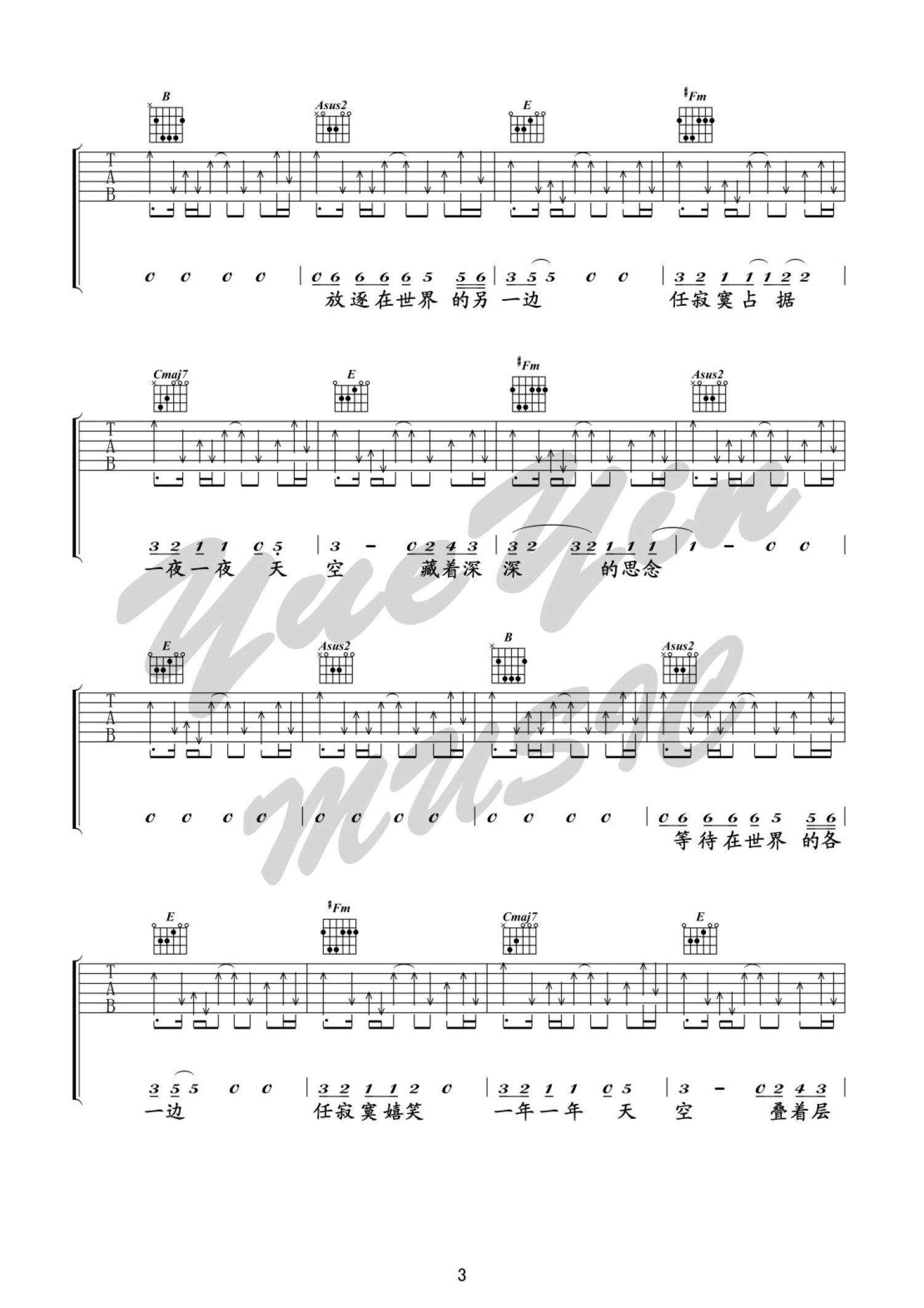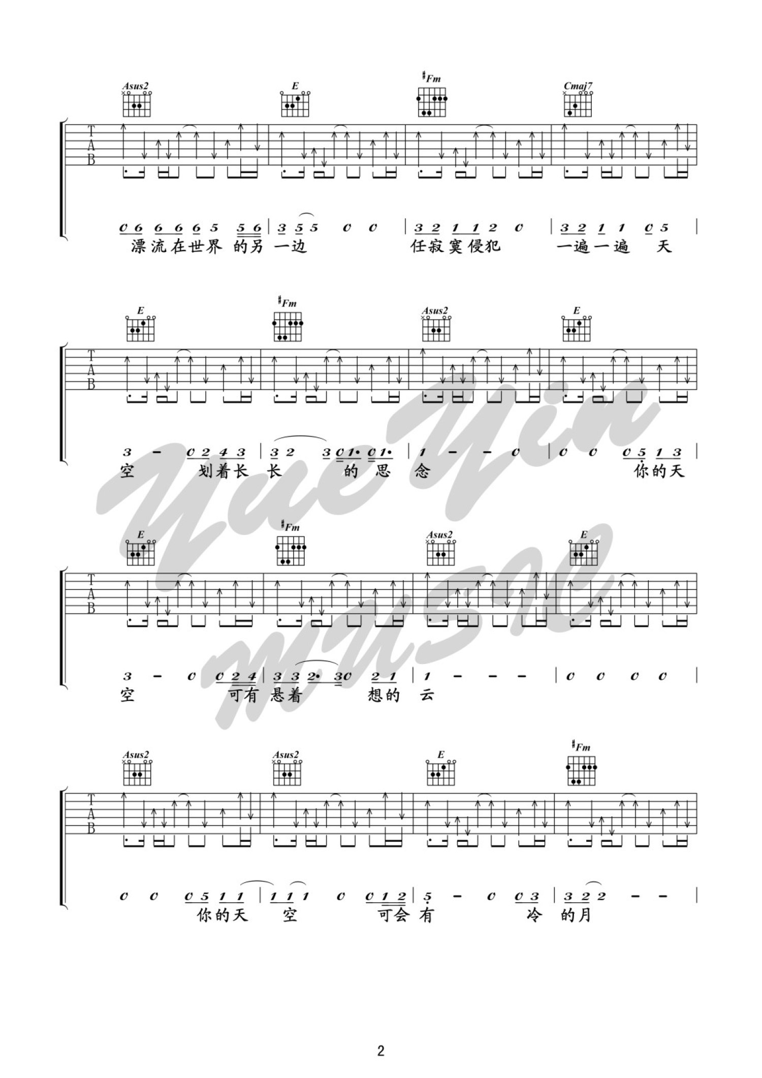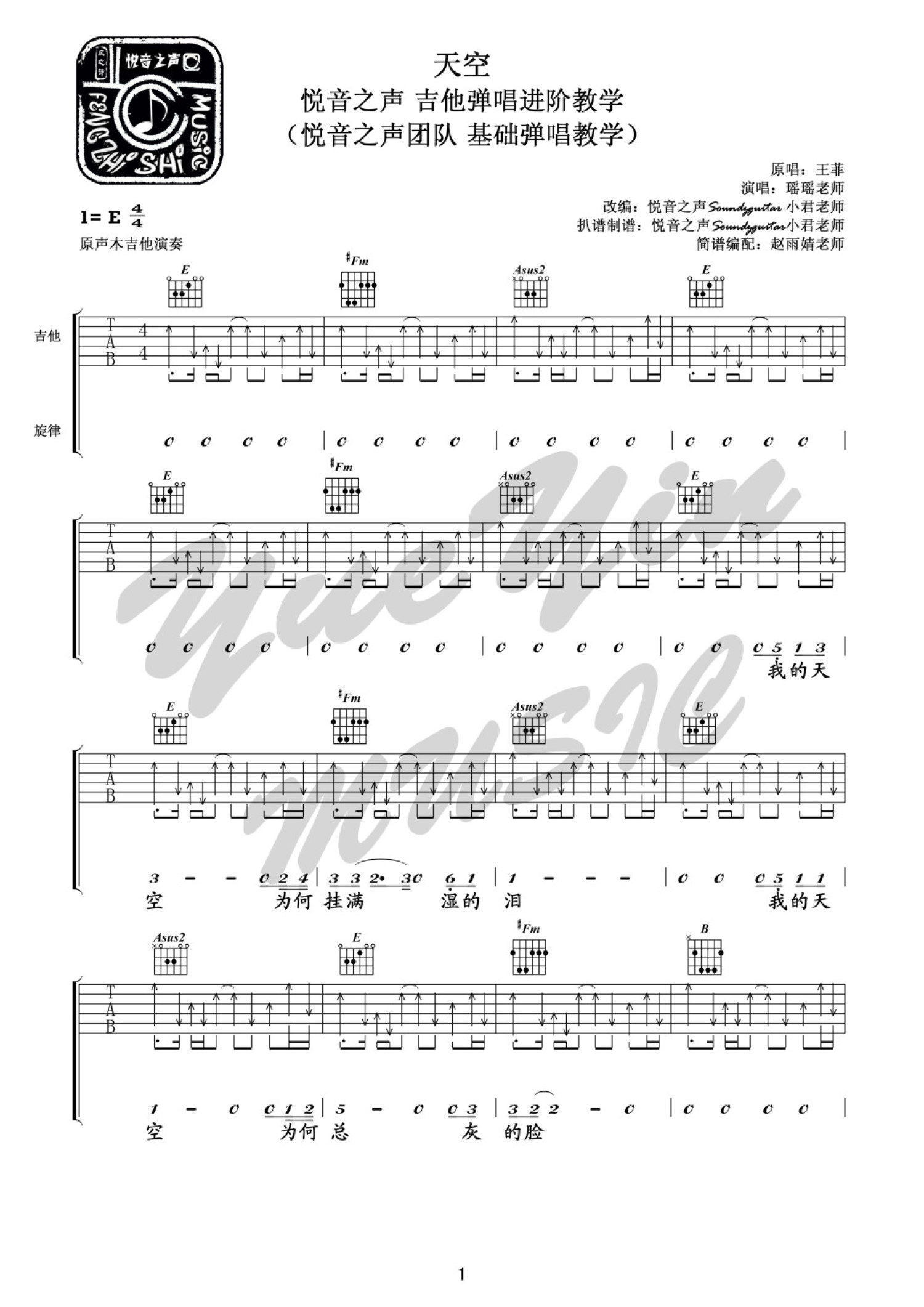 曲谱介绍: 悦音之声E调版 王菲《天空》吉他弹唱六线谱