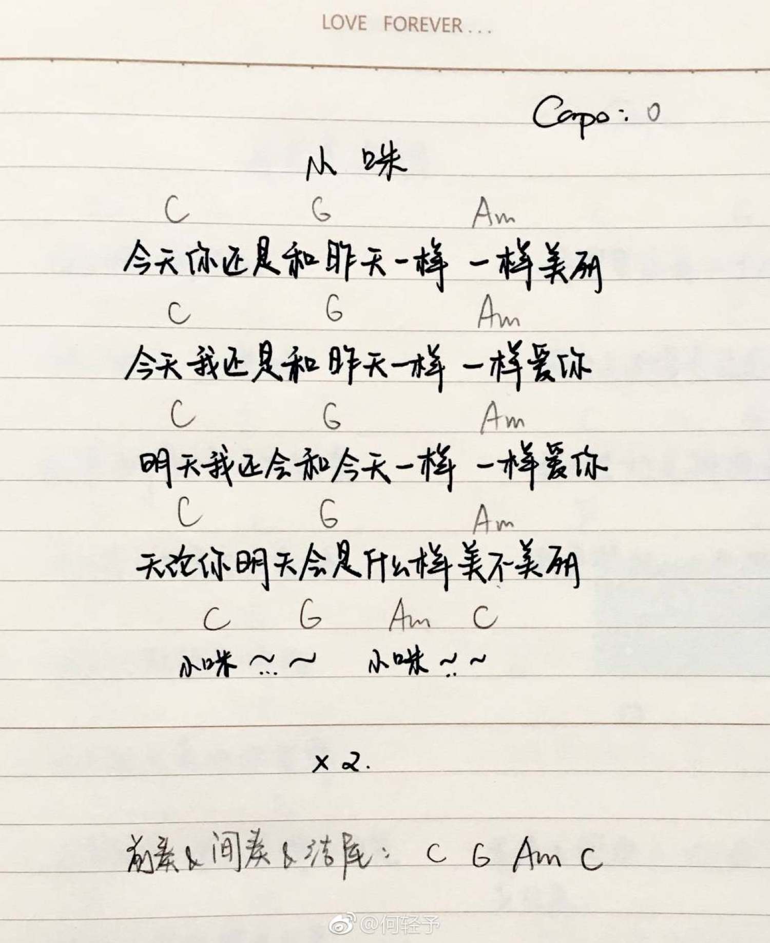 曲谱介绍: 花粥《小咪》吉他和弦弹唱谱