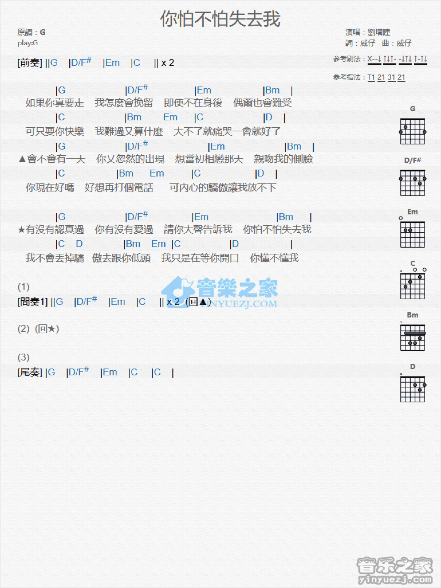 曲谱介绍: G调版《你怕不怕失去我》吉他和弦弹唱谱