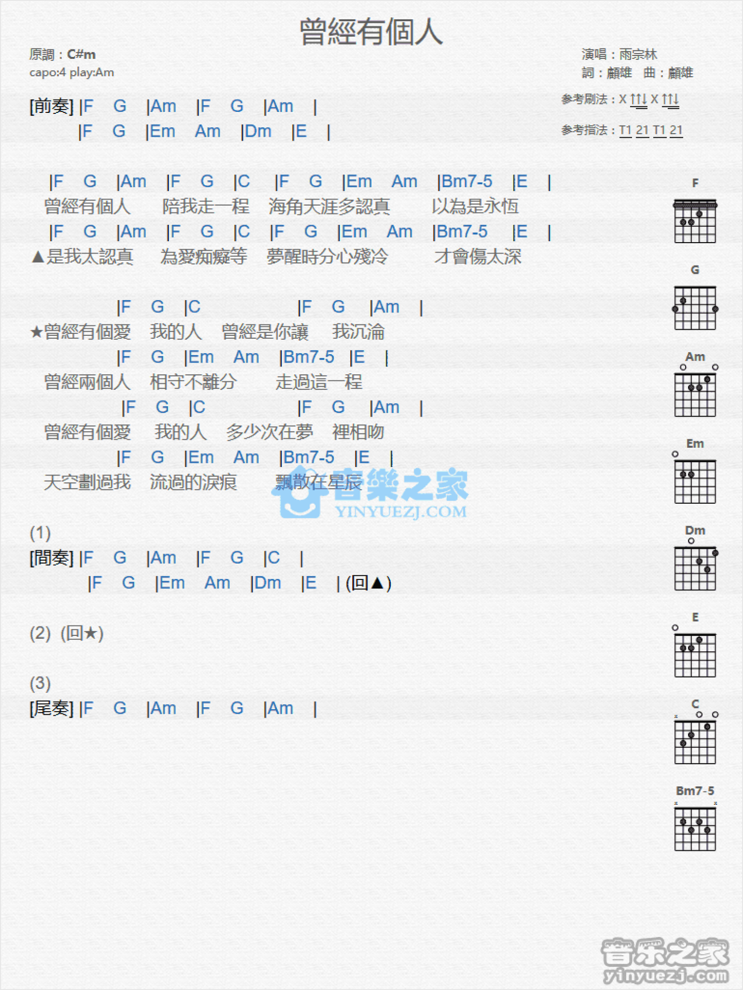 曲谱介绍: Am调版《曾经有个人》吉他和弦弹唱谱