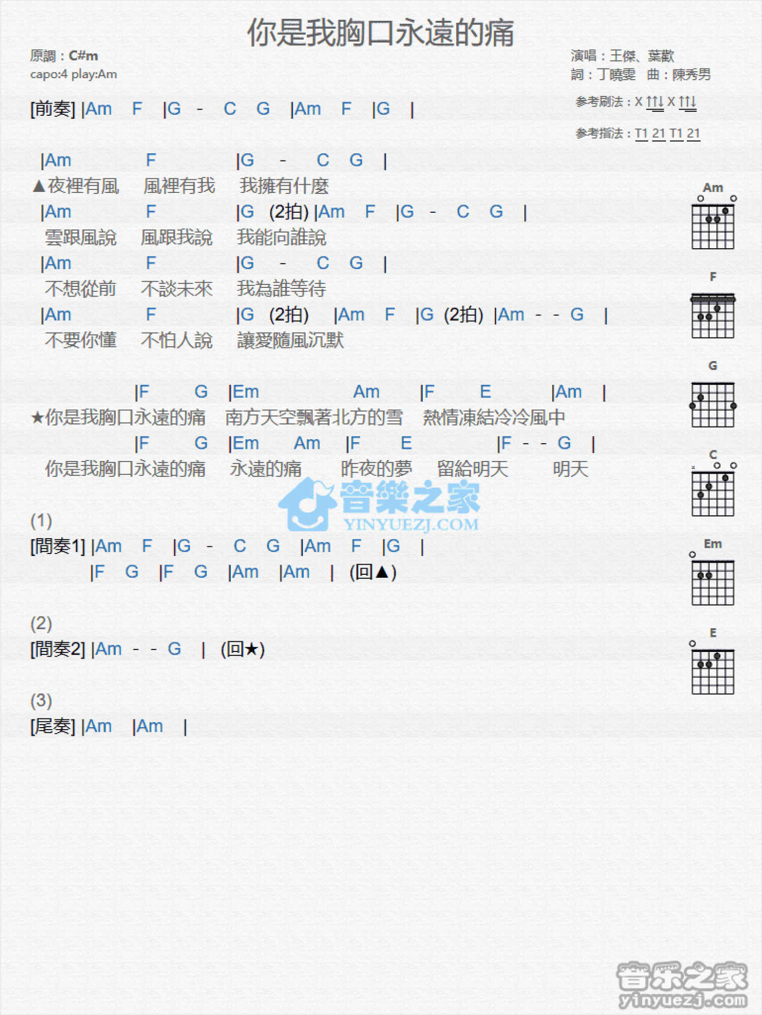 曲谱介绍: Am调版 王杰/叶欢《你是我胸口永远的痛》吉他和弦弹唱谱