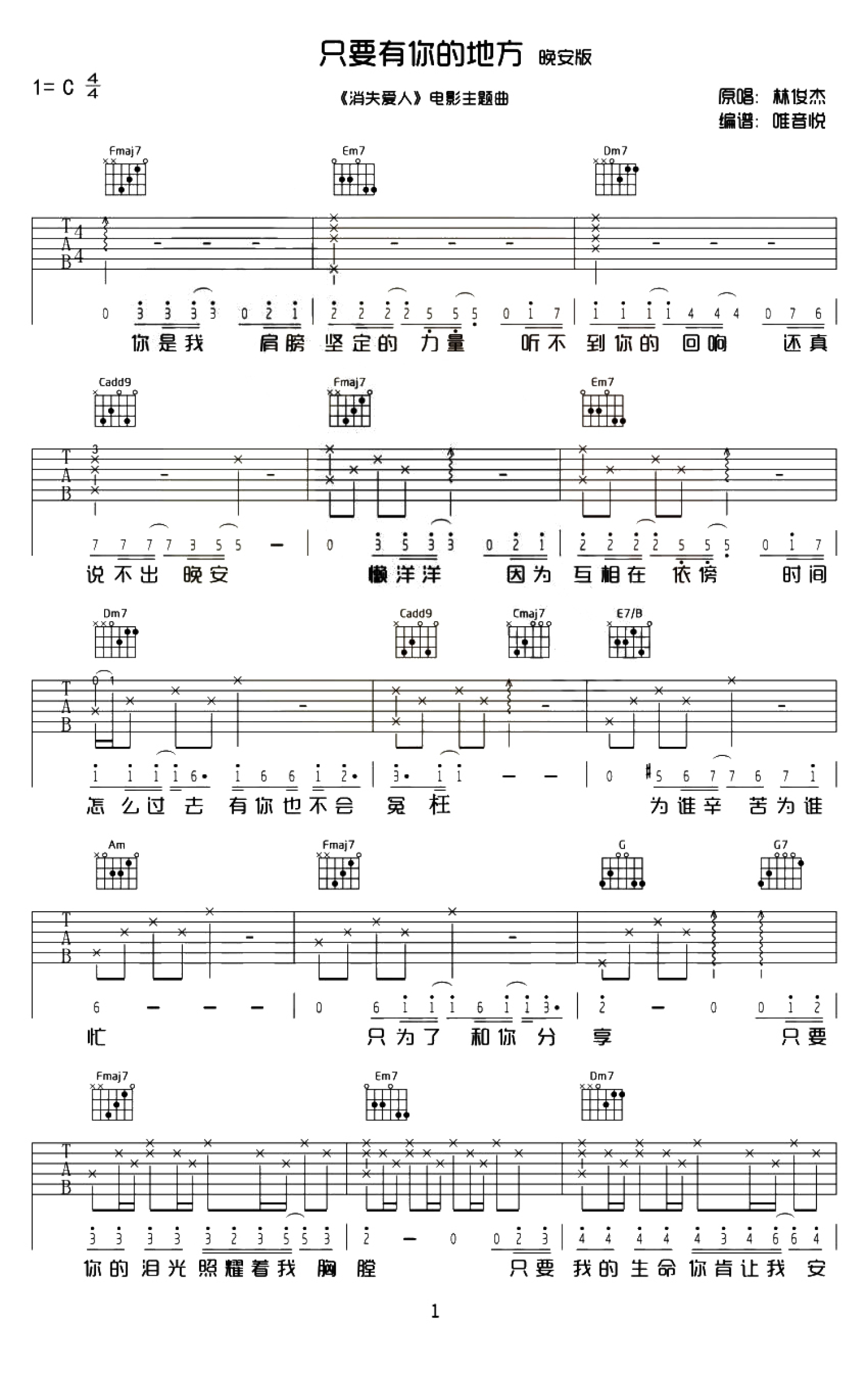 曲谱介绍: 副标题#e#林俊杰只要有你的地方吉他谱,C调指法编配,电影《消失的爱人》主题曲。我抬头看你像看见月亮,你低头会不会,想我,像思念故乡。林夕的词好美,林俊杰的声音好暖,像一个唯美伤感爱情故事,唱出了想要个心灵港湾的渴望。#p#副标题#e#只要有你的地方吉他谱,林俊杰演唱,当前页面显示的是歌曲的后两张图片谱子。这是林俊杰式的浪漫情歌,也是痛到撕心裂肺也是一种幸福的极度浪漫主义。词曲搭配与电影主题相互呼应,只要有你,哪怕失去一切都不值一提。