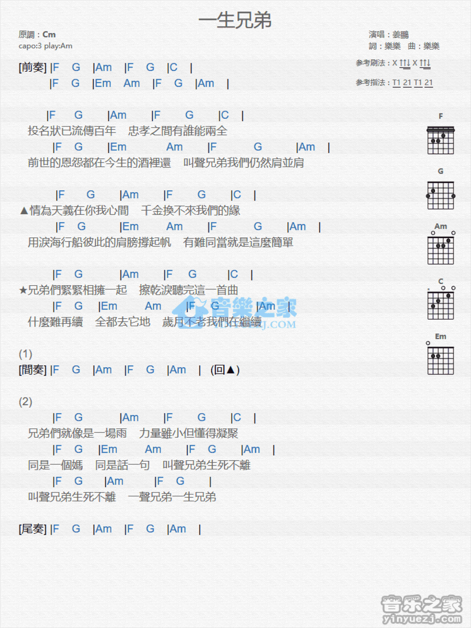 曲谱介绍: Am调版 姜鹏《一生兄弟》吉他和弦弹唱谱