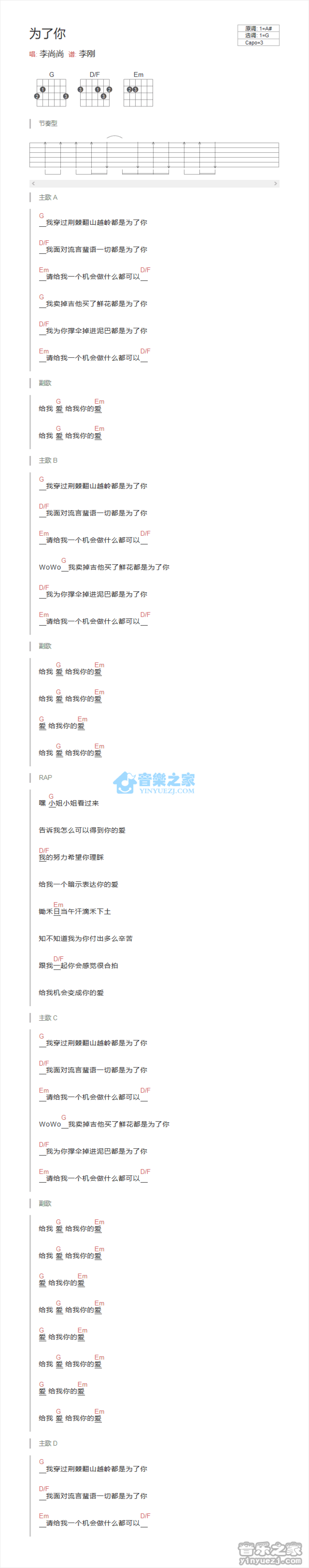 曲谱介绍: G调版 李尚尚《为了你》吉他和弦弹唱谱