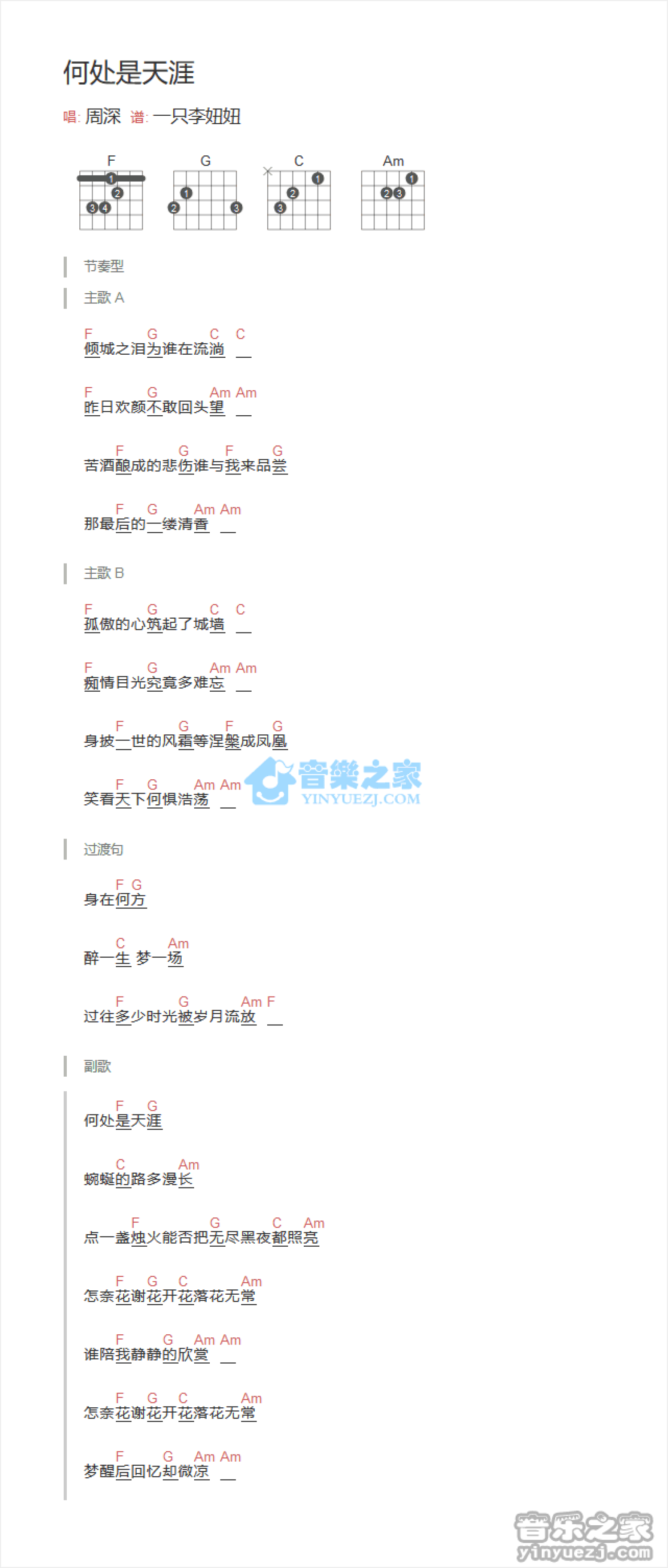 曲谱介绍: 《何处是天涯》吉他和弦弹唱谱