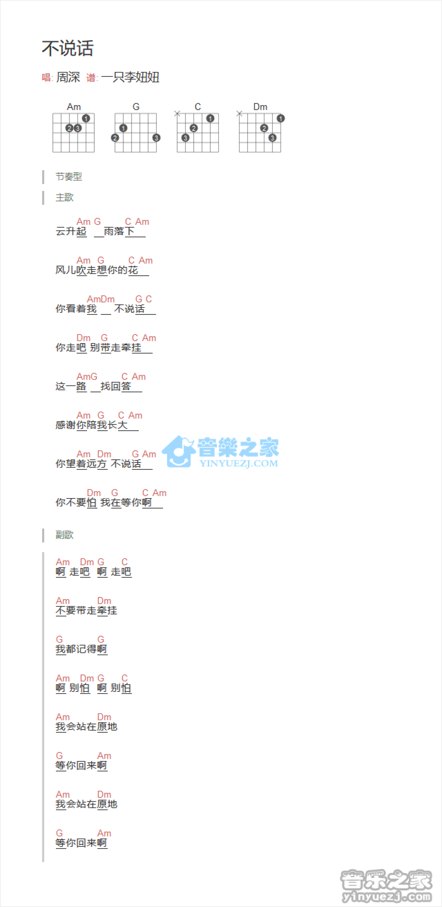 不说话吉他谱 - 周深 - 吉他弹唱谱 - 和弦谱