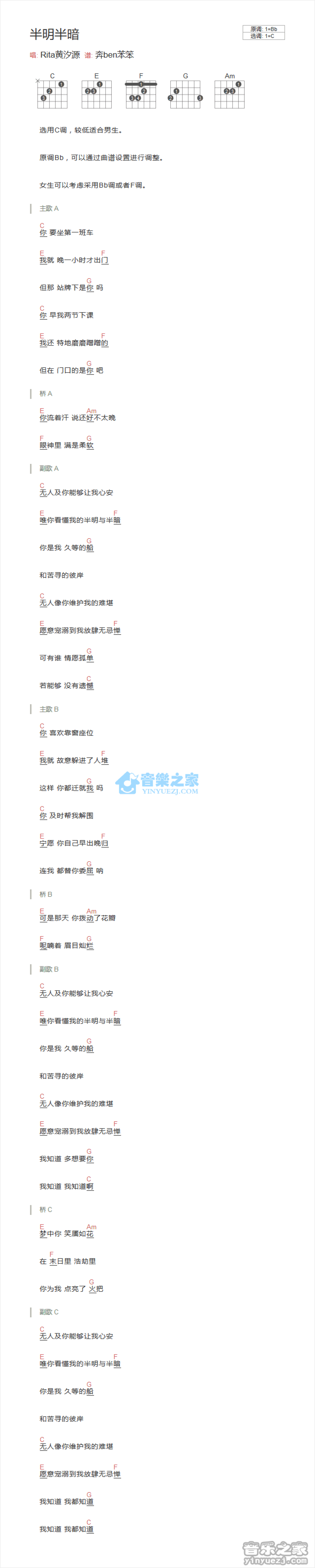 曲谱介绍: C调版 Rita黄汐源《半明半暗》吉他和弦弹唱谱
