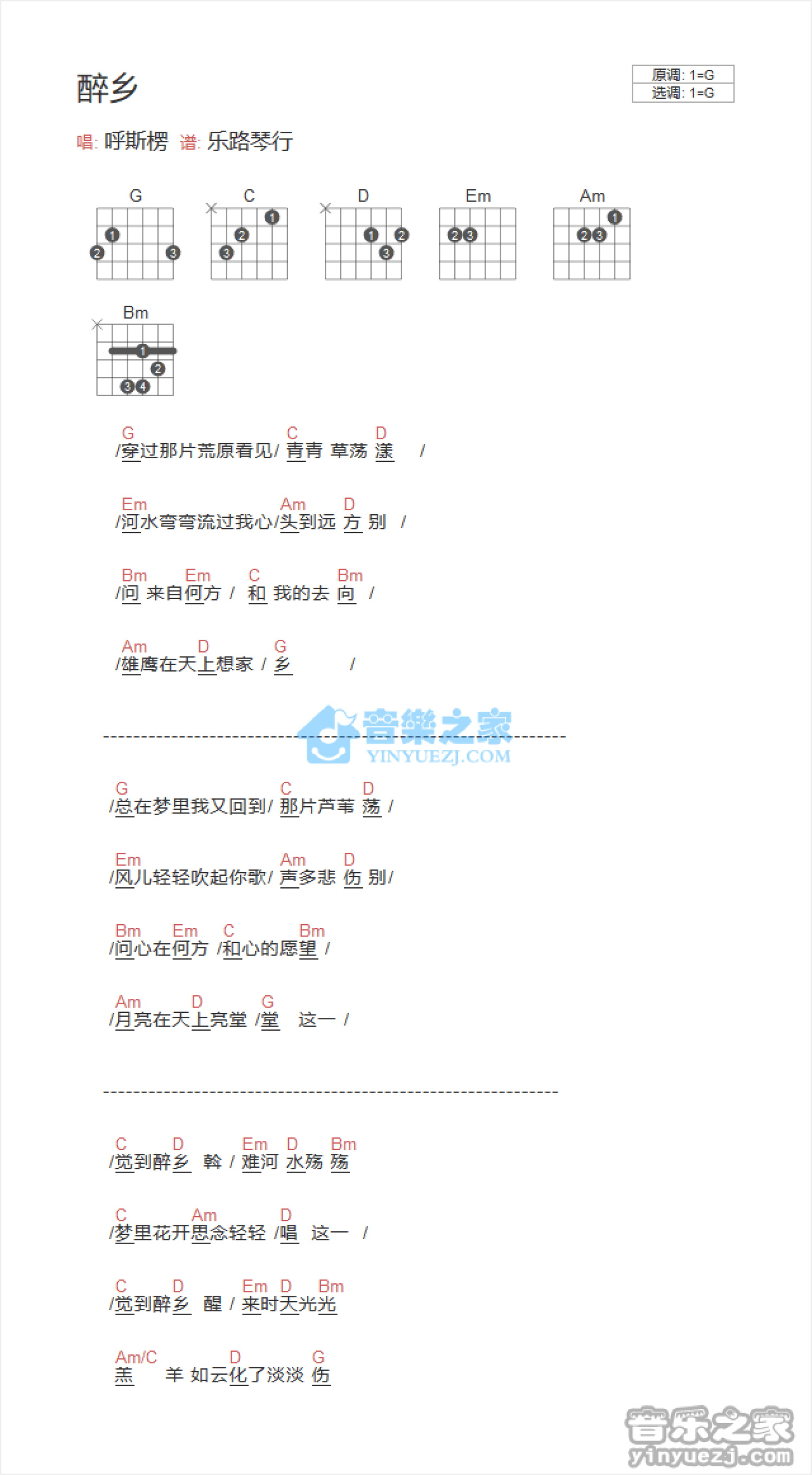 曲谱介绍: G调版 呼斯楞《醉乡》吉他和弦弹唱谱