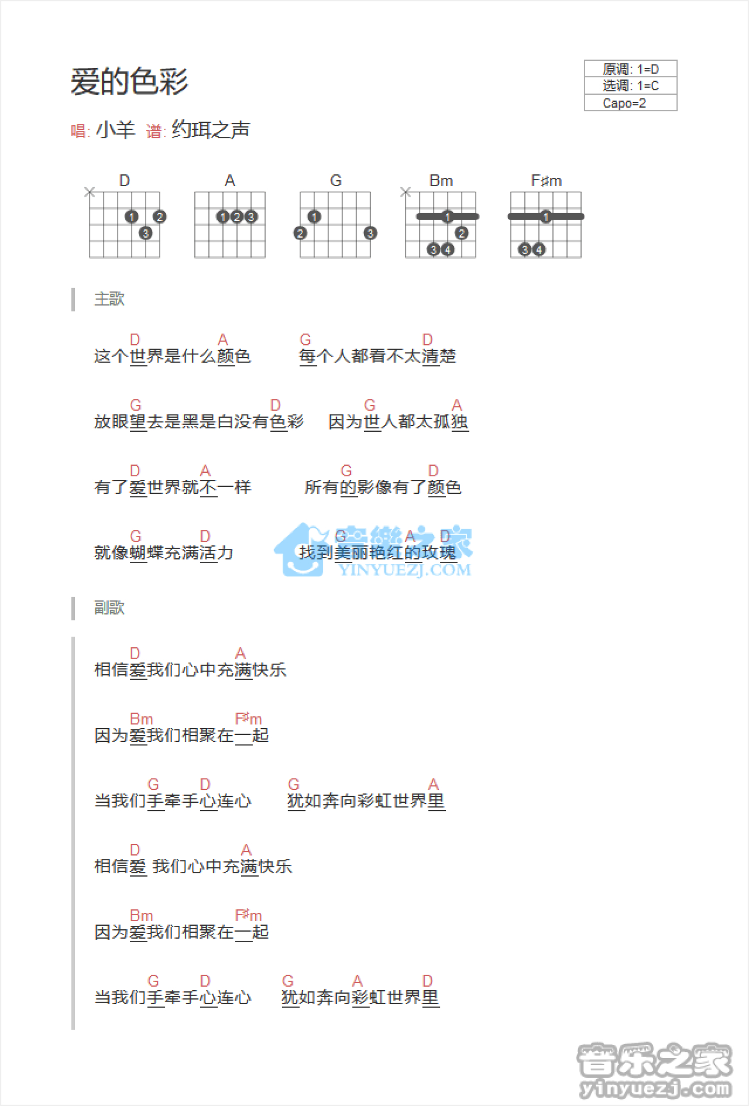 曲谱介绍: C调版 小羊《爱的色彩》吉他和弦弹唱谱