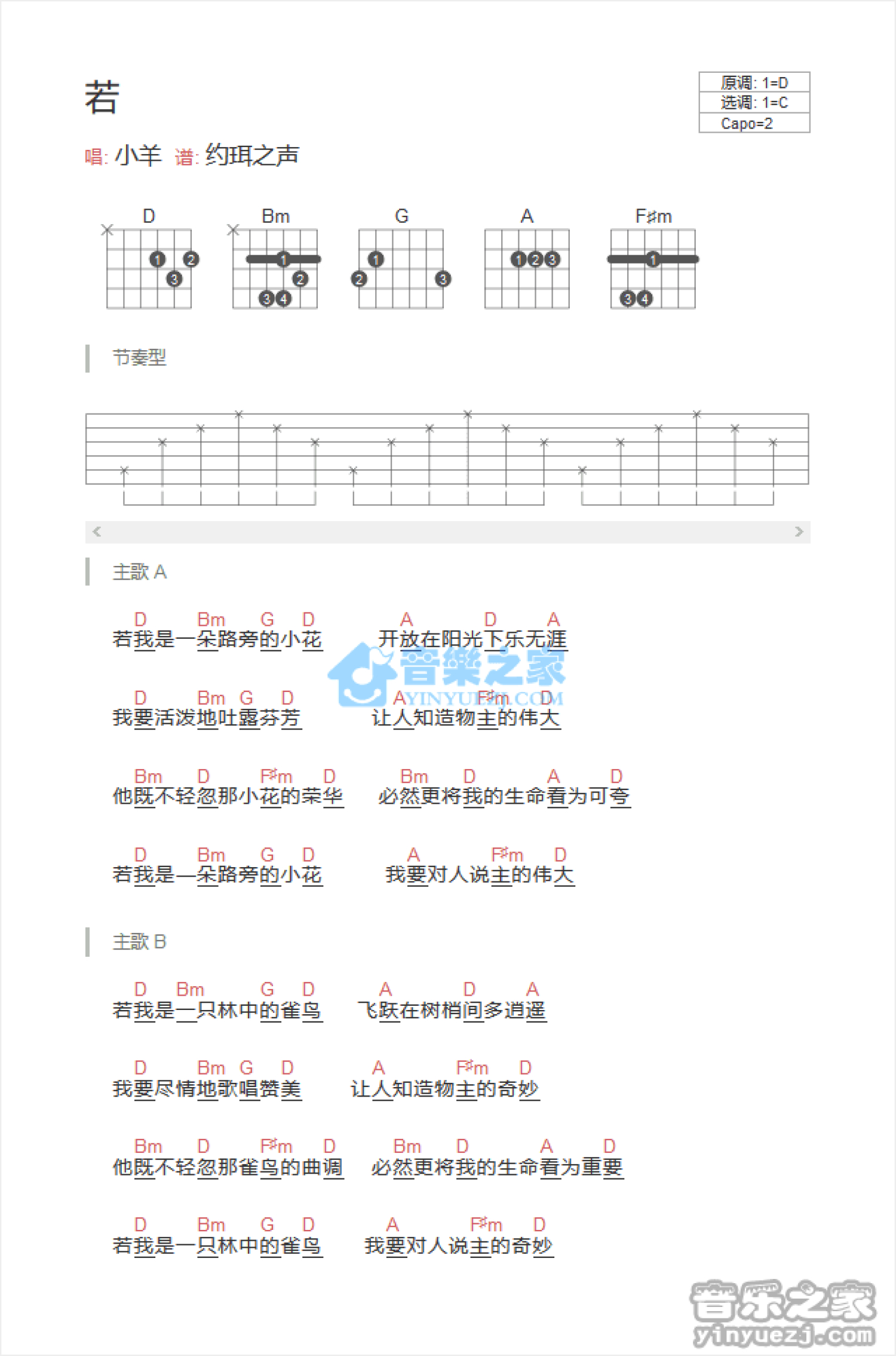 曲谱介绍: C调版 基督教歌曲《若》吉他和弦弹唱谱