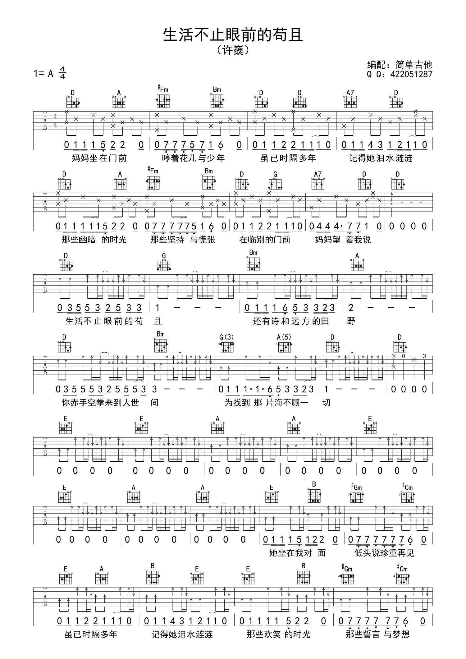 • 生活不止眼前的苟且吉他谱 - 许巍 - A调吉他弹唱谱第1张