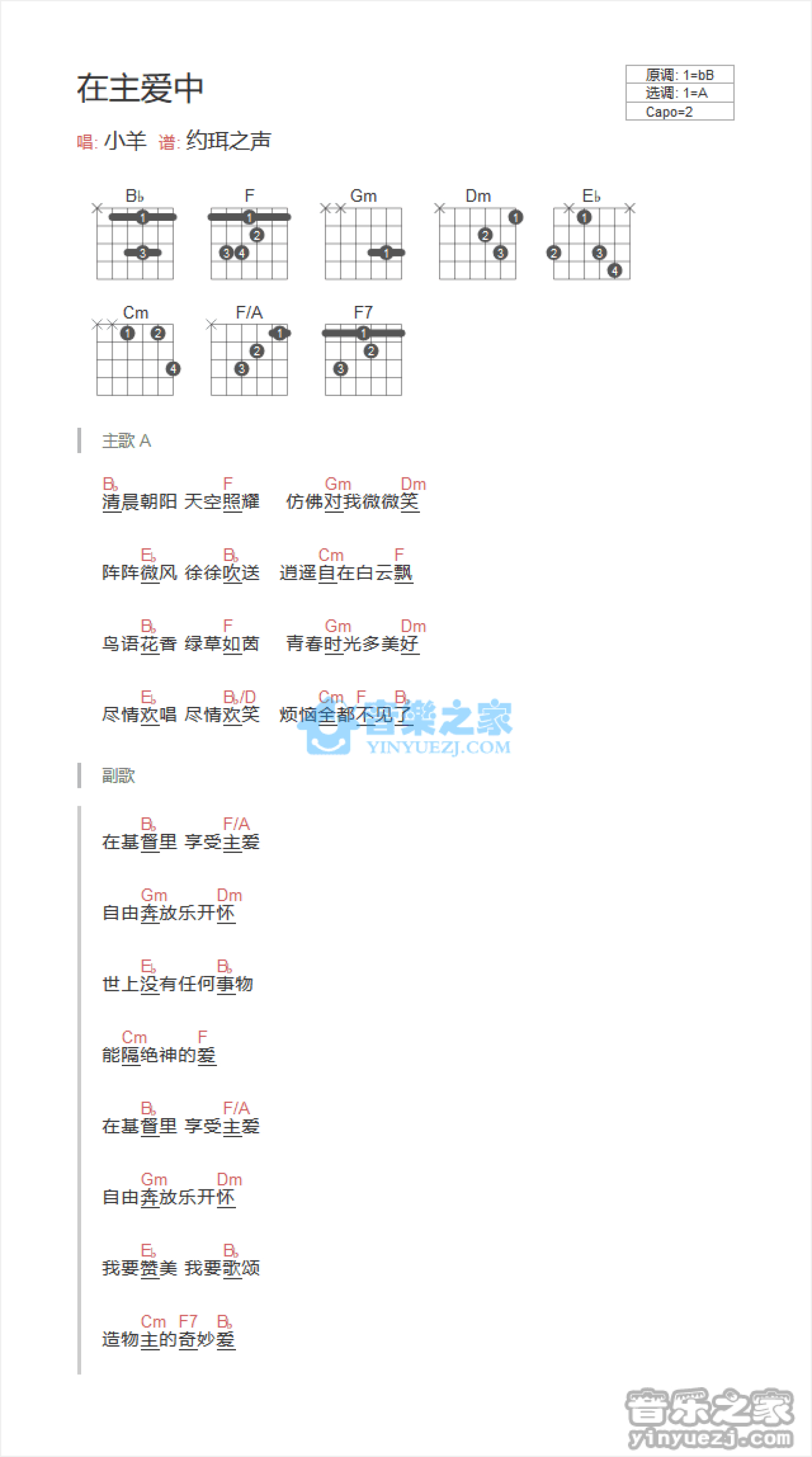 曲谱介绍: A调版 小羊《在主爱中》吉他和弦弹唱谱