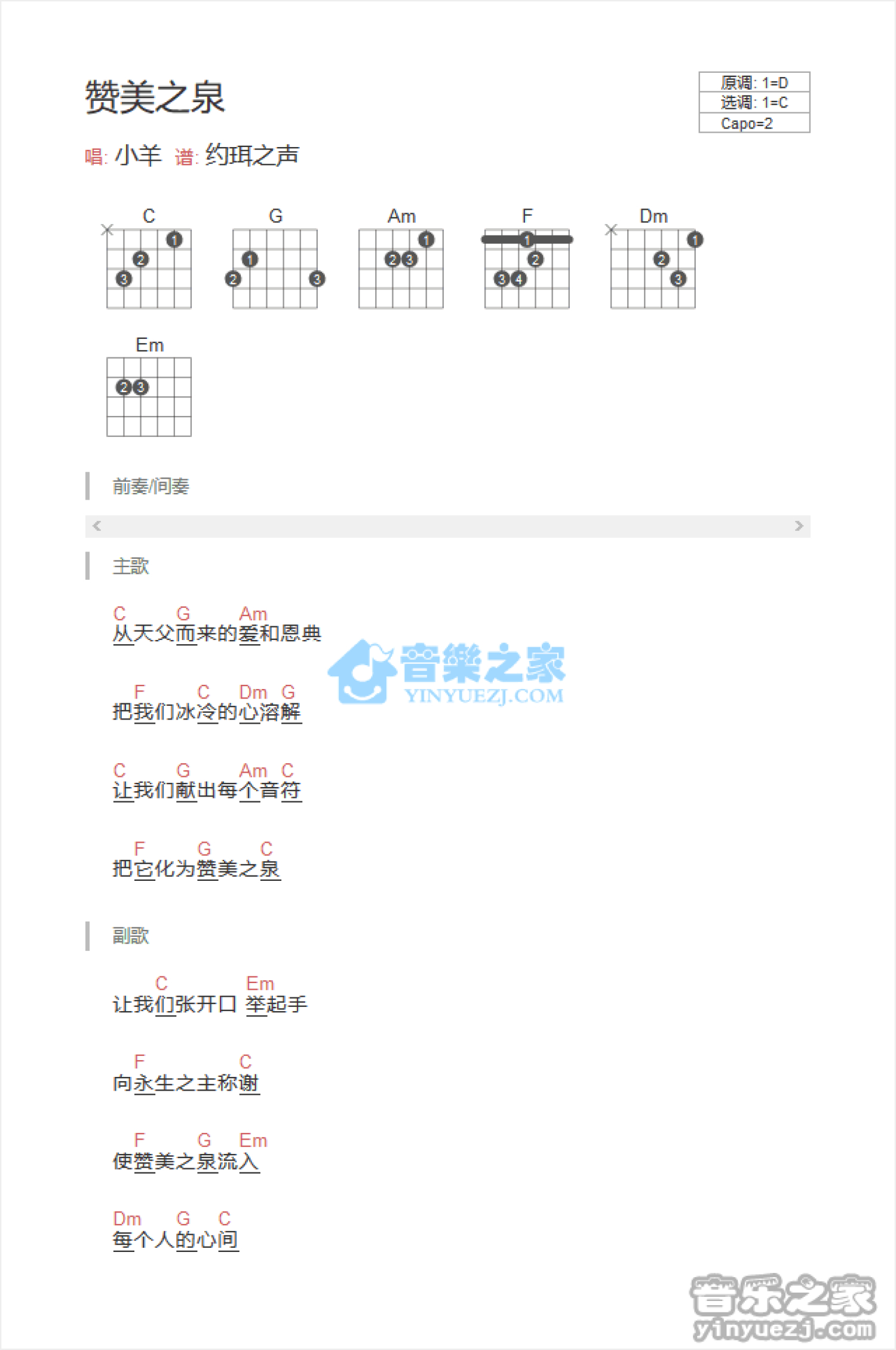 曲谱介绍: C调版 小羊《赞美之泉》吉他和弦弹唱谱