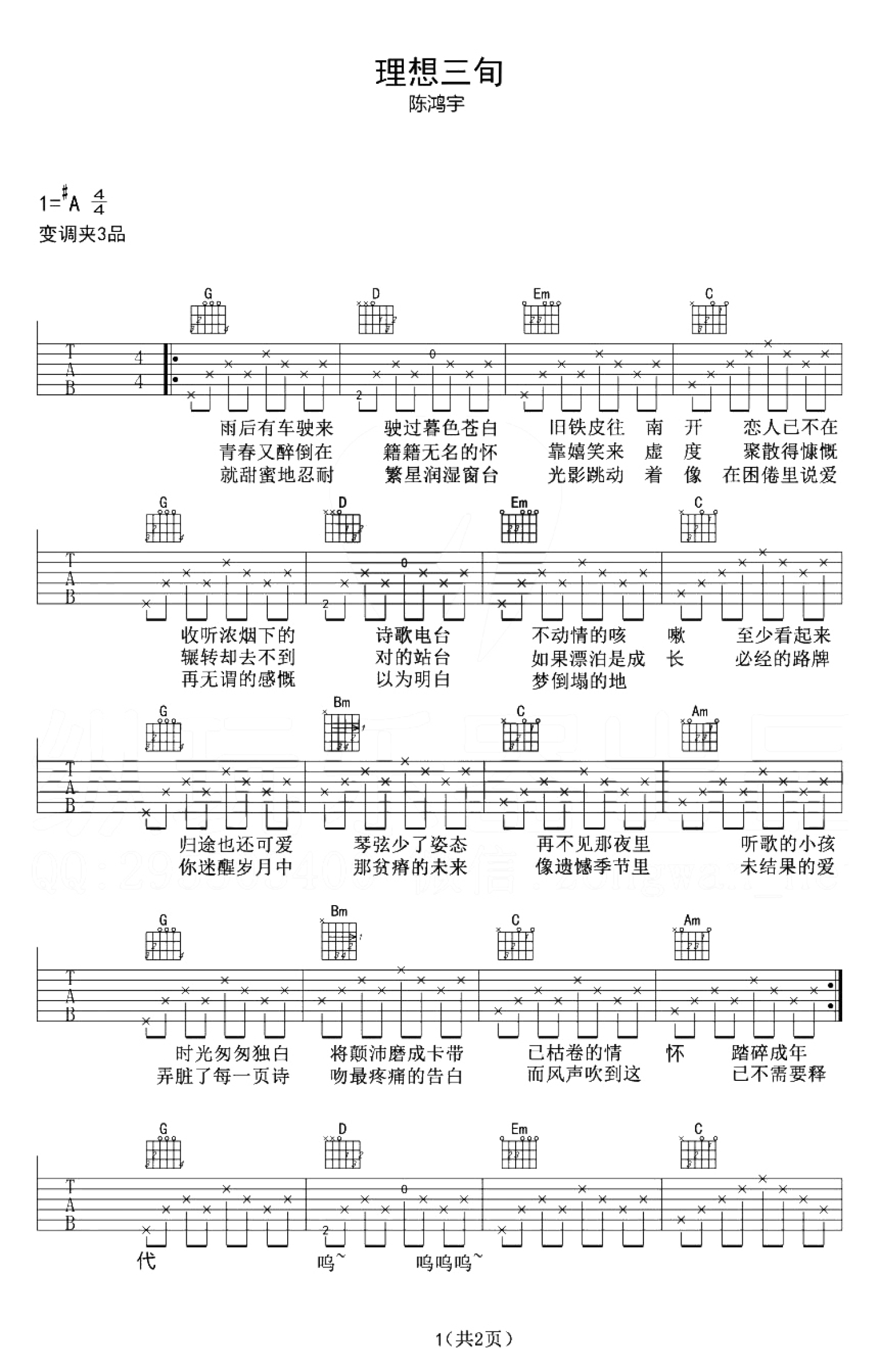 理想三旬吉他谱 - 陈鸿宇 - A调吉他弹唱谱