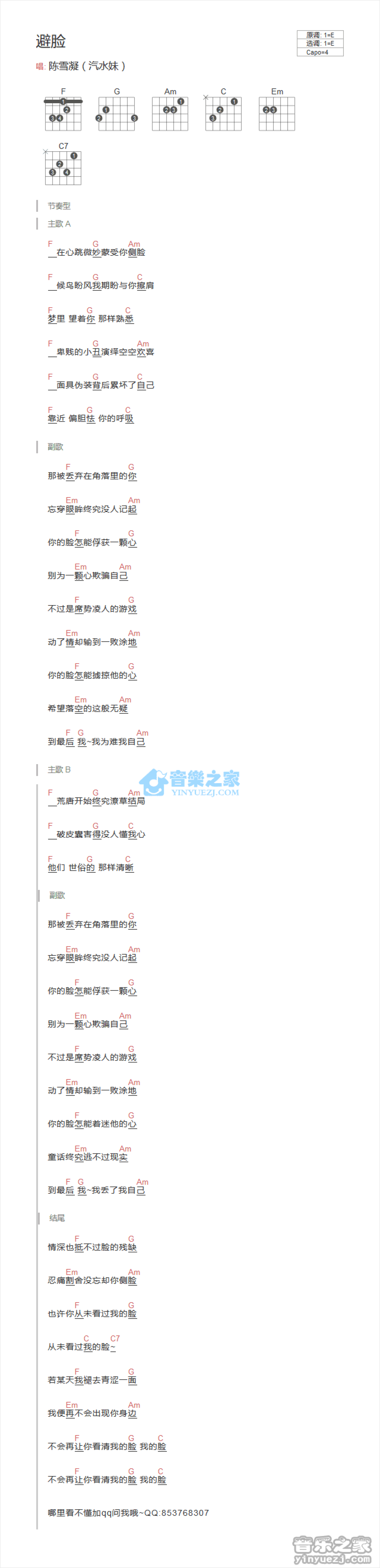 曲谱介绍: E调版《避脸》吉他和弦弹唱谱