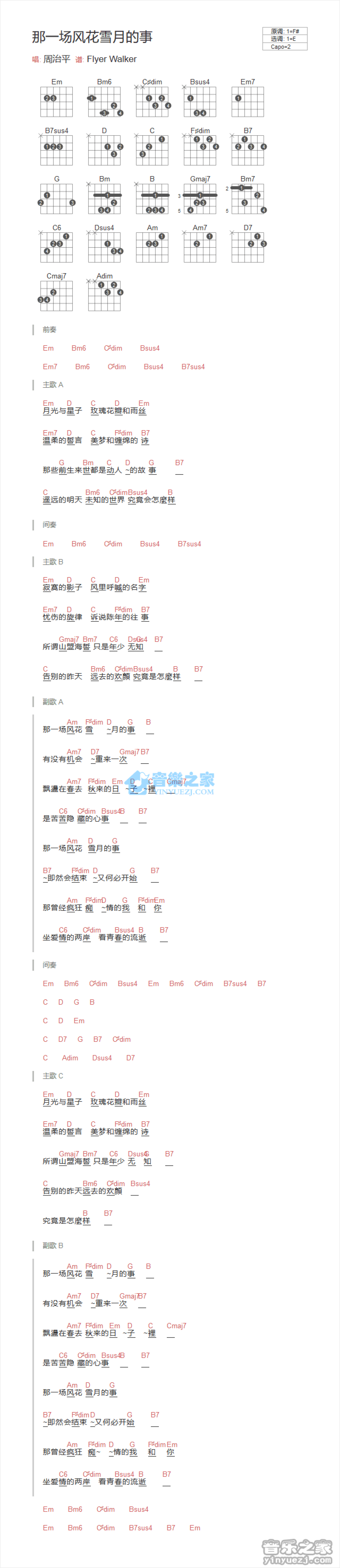 曲谱介绍: E调版 周治平《那一场风花雪月的事》吉他和弦弹唱谱