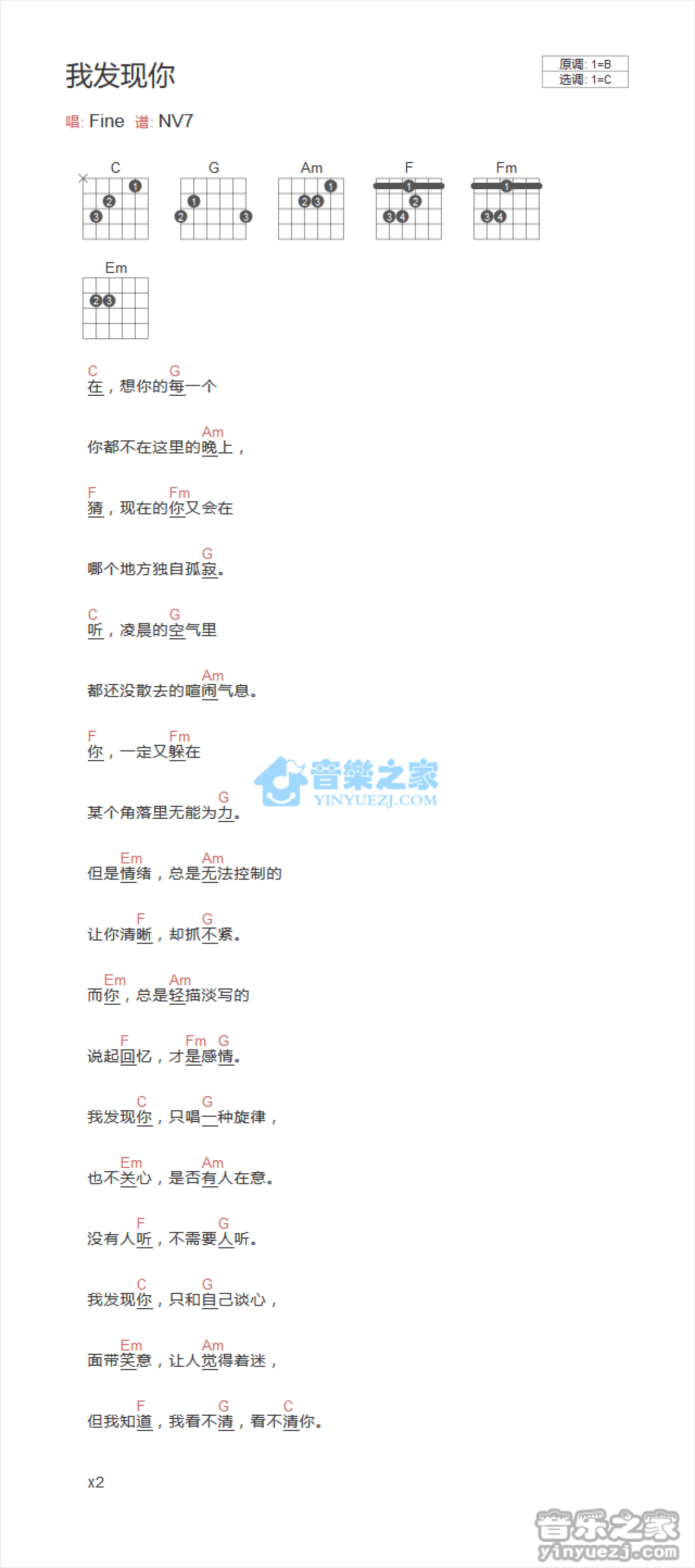 曲谱介绍: C调版 Fine《我发现你》吉他和弦弹唱谱