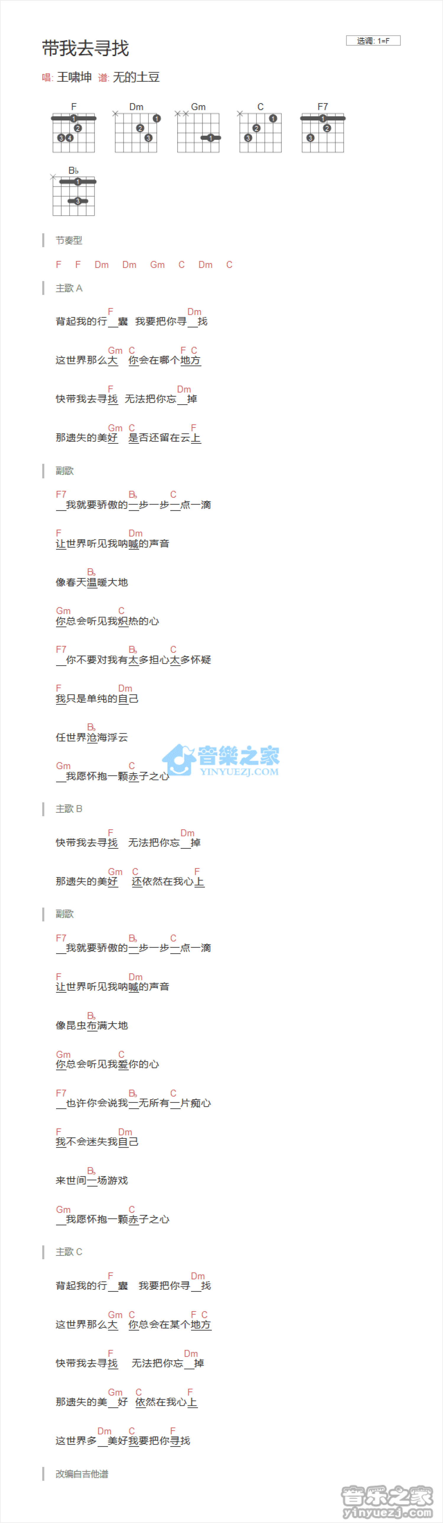 曲谱介绍: F调版《带我去寻找》吉他和弦弹唱谱