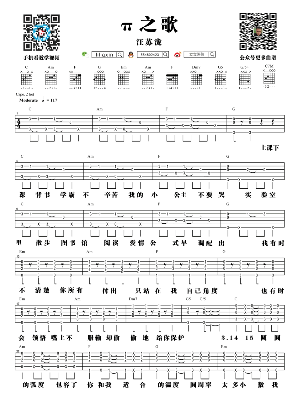 曲谱介绍: 汪苏泷π之歌吉他谱,Capo夹二品,C调指法,汪苏泷的一首好听的吉他弹唱歌曲,电影《女汉子真爱公式》片尾曲,旋律轻快,歌词甜蜜,随谱附上立立阿信为琴友们准备的《π之歌》吉他弹唱视频教学。