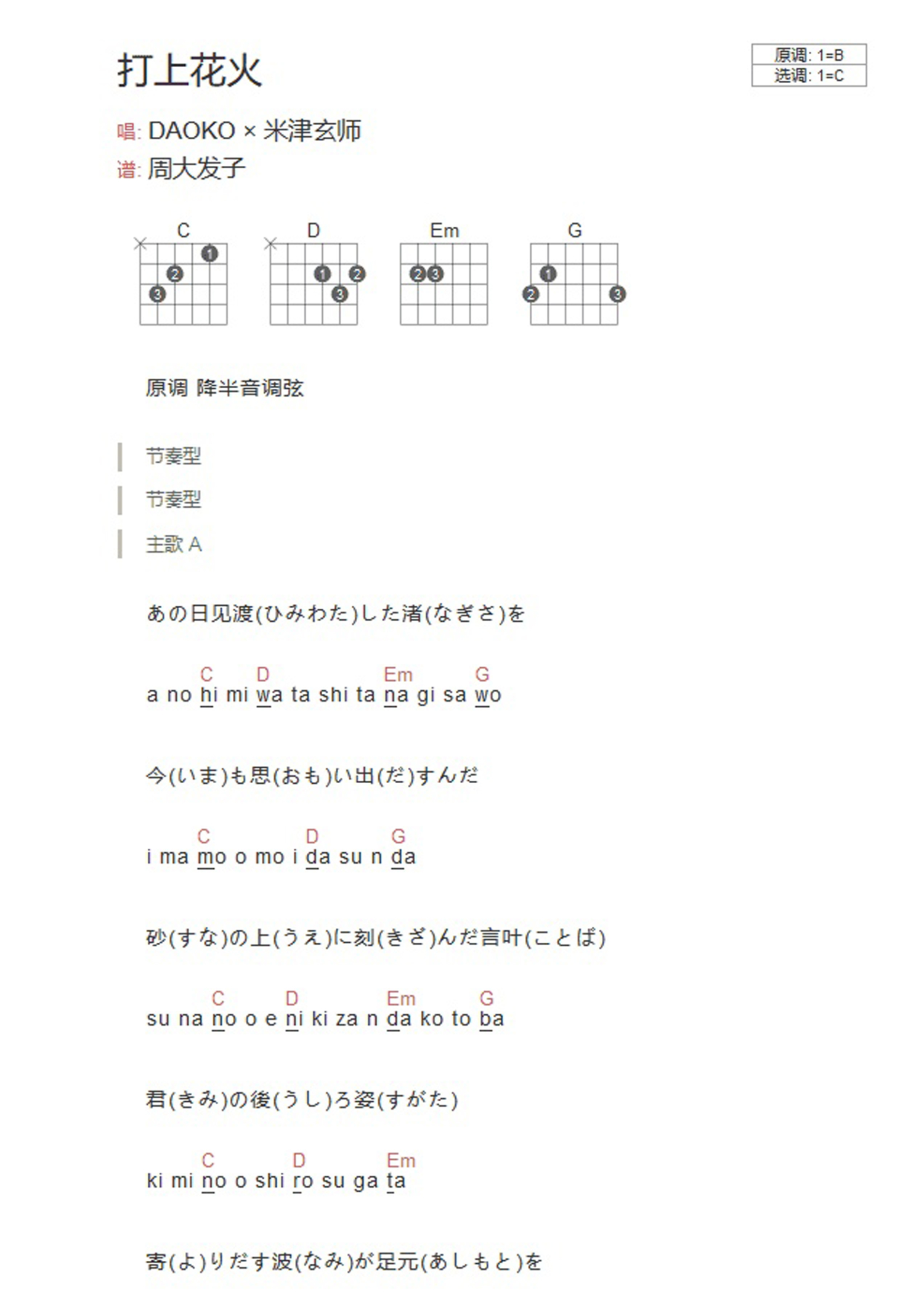 打上火花吉他谱 - DAOKO/米津玄师 - C调吉他弹唱谱 - 和弦谱