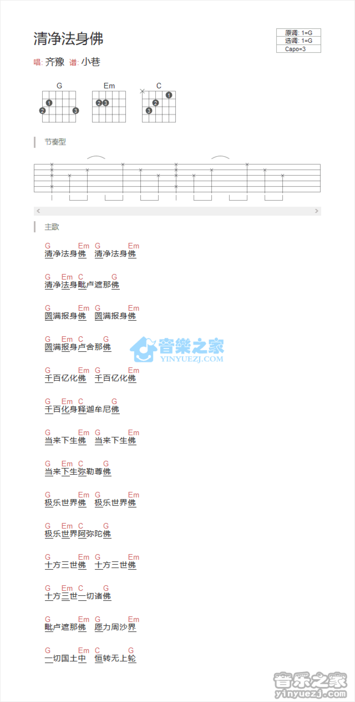 曲谱介绍: G调版 齐豫《清净法身佛》吉他和弦弹唱谱