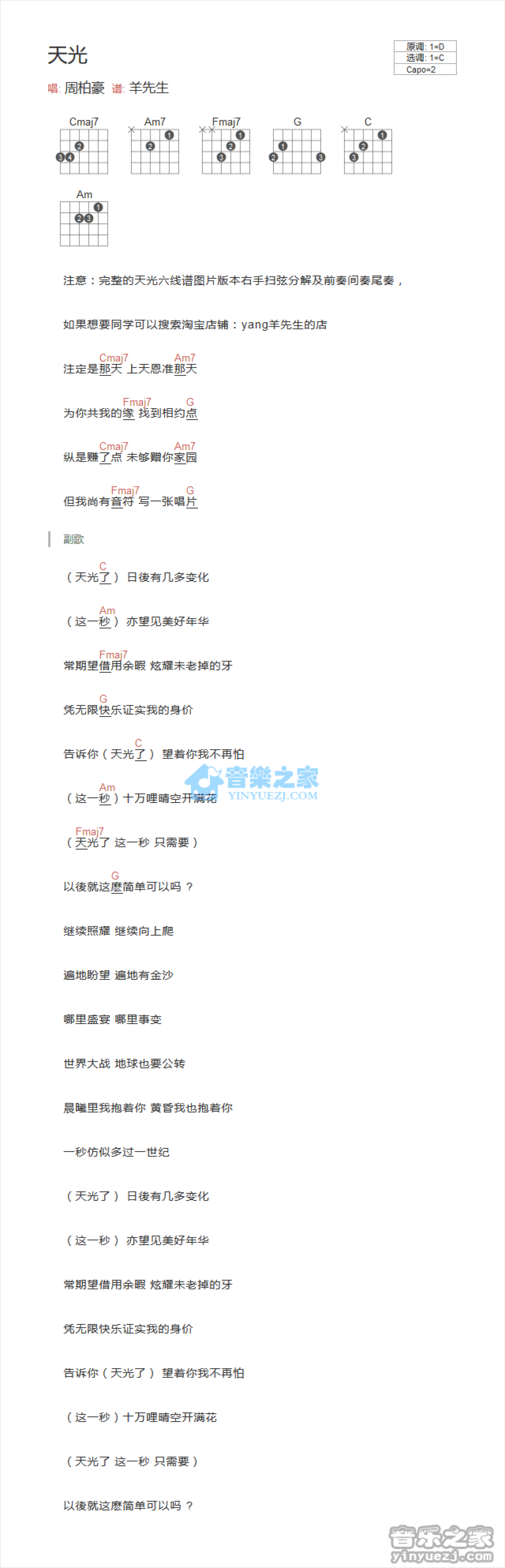 曲谱介绍: C调版 周柏豪《天光》吉他和弦弹唱谱
