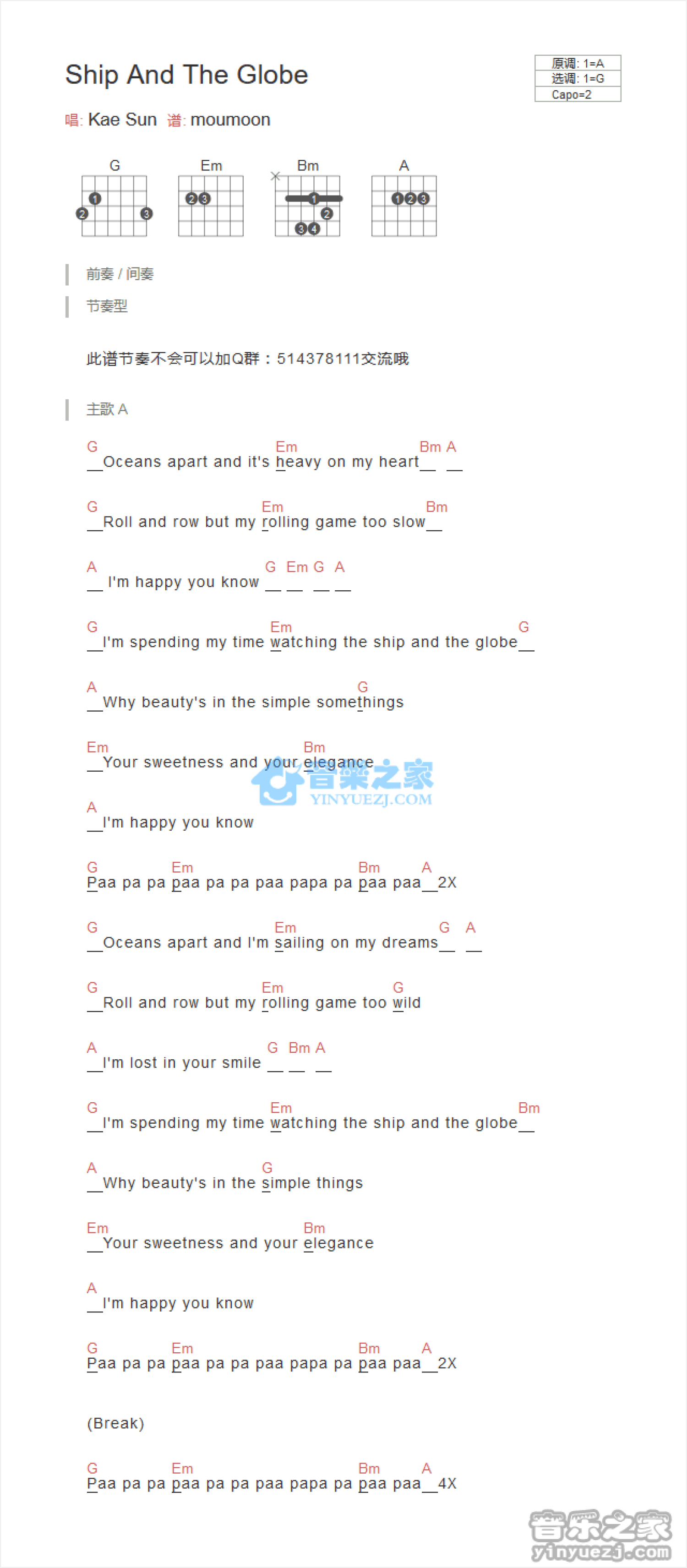 曲谱介绍: G调版 Kae Sun《Ship And The Globe》吉他和弦弹唱谱